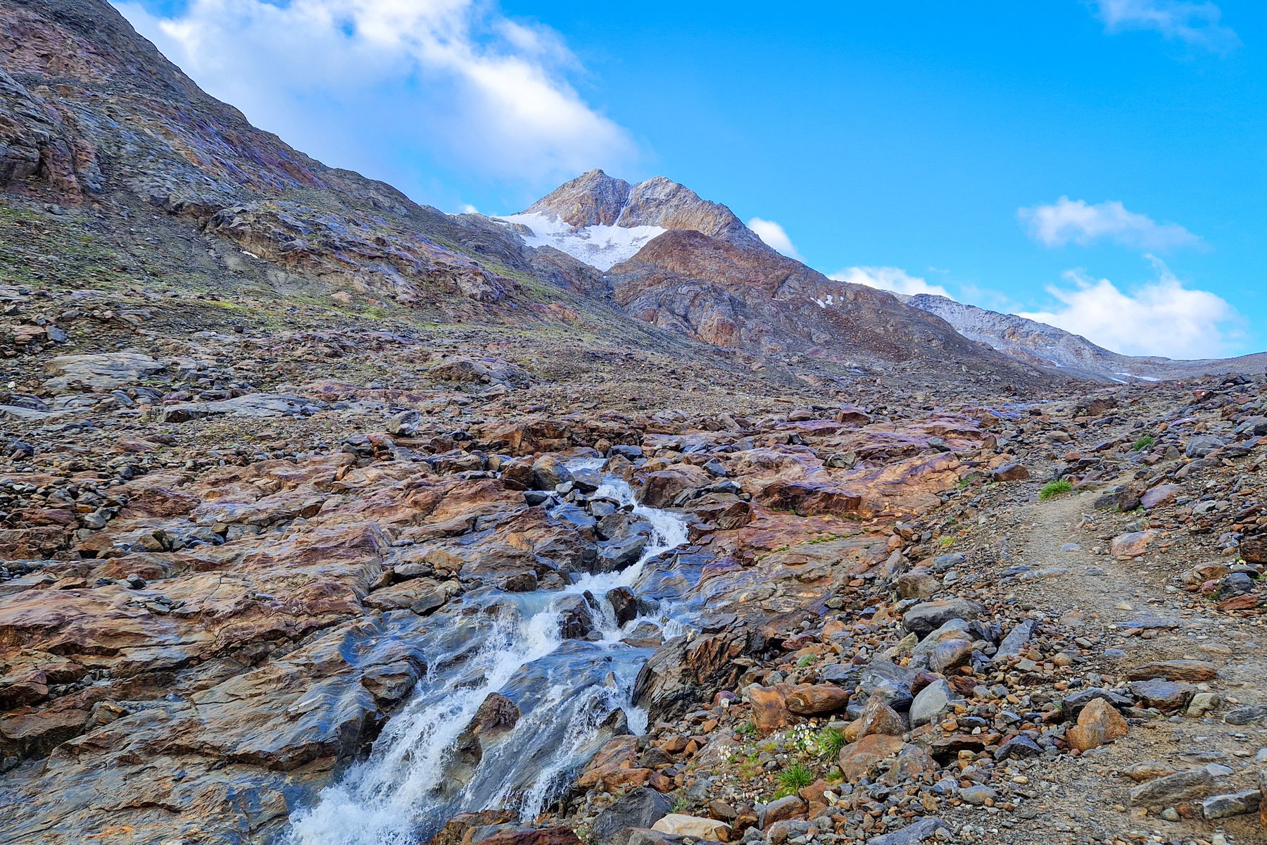 Verlaufen kann man sich hier nicht: Es gibt einen Weg und der führt von der Similaunhütte auf 13 Kilometer Länge bergab, vorbei an der Martin-Busch-Hütte.