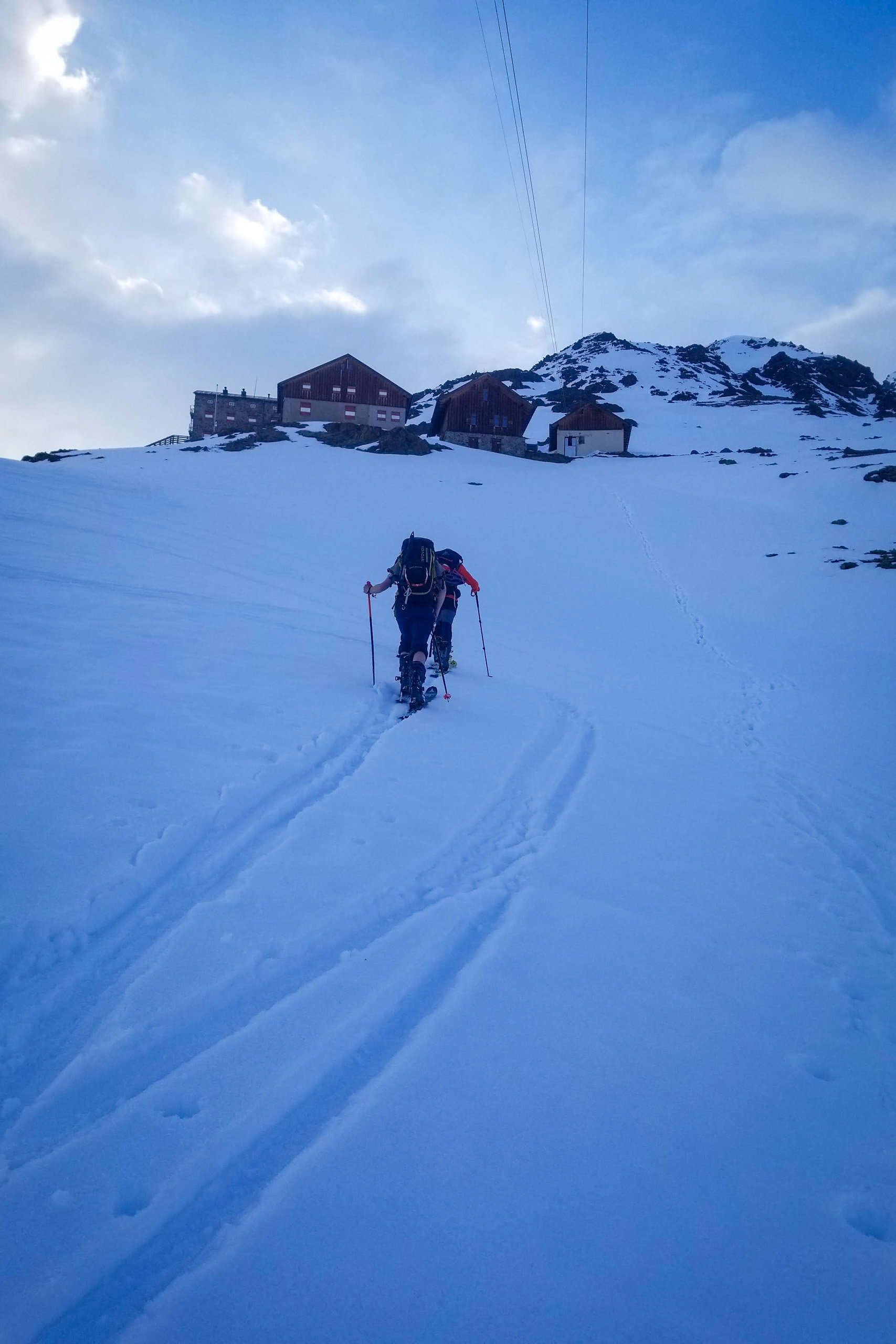 Am Talende bei der Materialseilbahn wird das Gelände etwas steiler, nach einigen Kehren erreicht man schlussendlich den Winterraum des Taschachhauses auf 2.434 Metern. Winterraum ist hier eigentlich der falsche Begriff, denn es gibt ein eigenes Winterhaus. Dieses ist geräumig, gut ausgestattet und bietet in 3 Lagern Platz für bis zu 27 Personen. In unserem Fall ist das Winterhaus zwar gut besucht, aber dennoch nicht überfüllt.