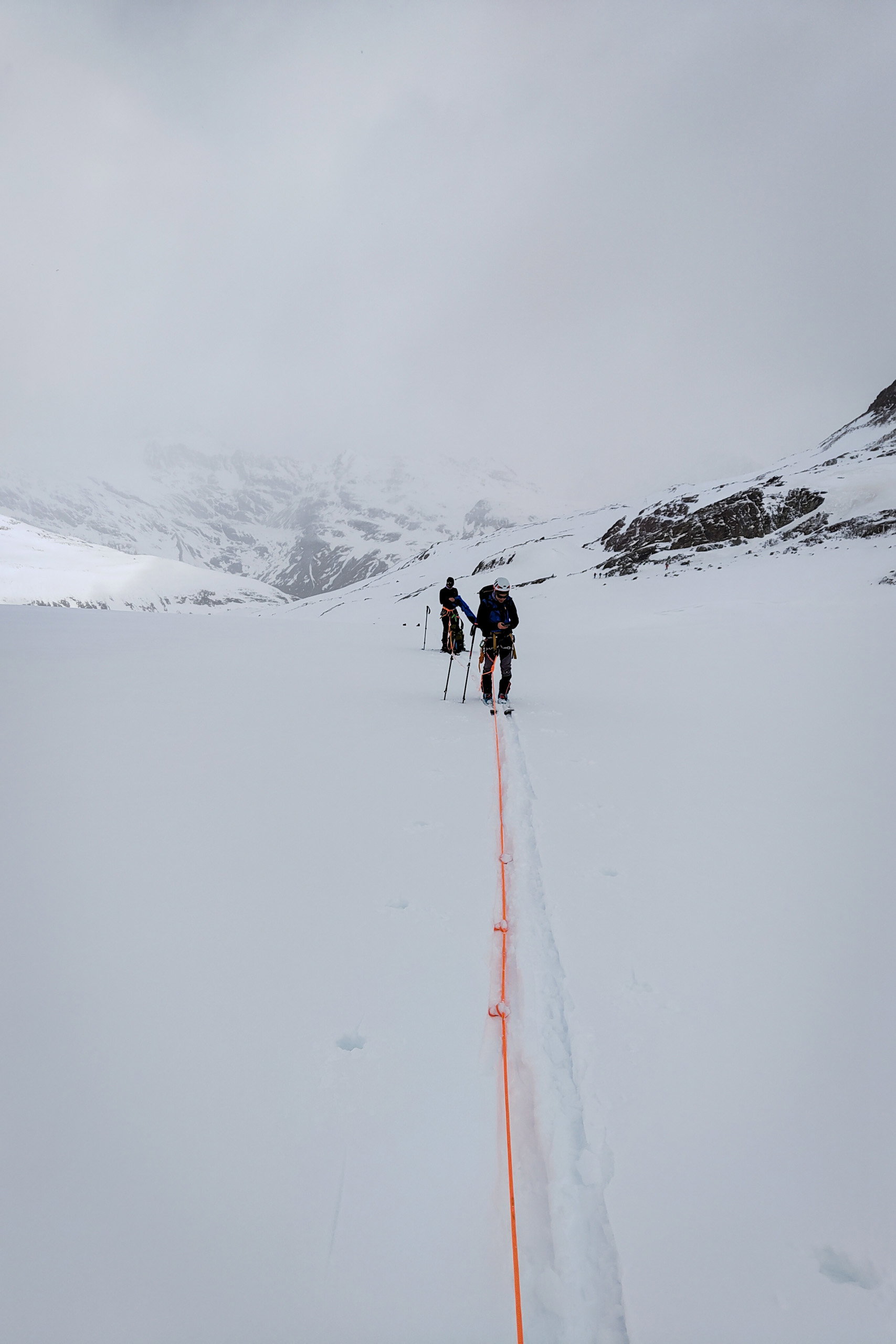 Das Skigebiet erreicht man allerdings nicht, man zweigt vorher nach links ab und steigt über den Hochjochferner zum Hauslabjoch auf. Der Hochjochferner ist sehr flach und dementsprechend lang ist auch der Aufstieg. Das durch das Whiteout verlorengegangene Zeitgefühl lässt den Aufstieg noch länger erscheinen.
