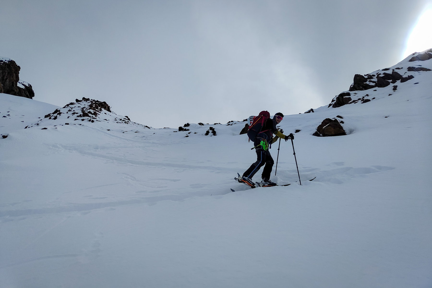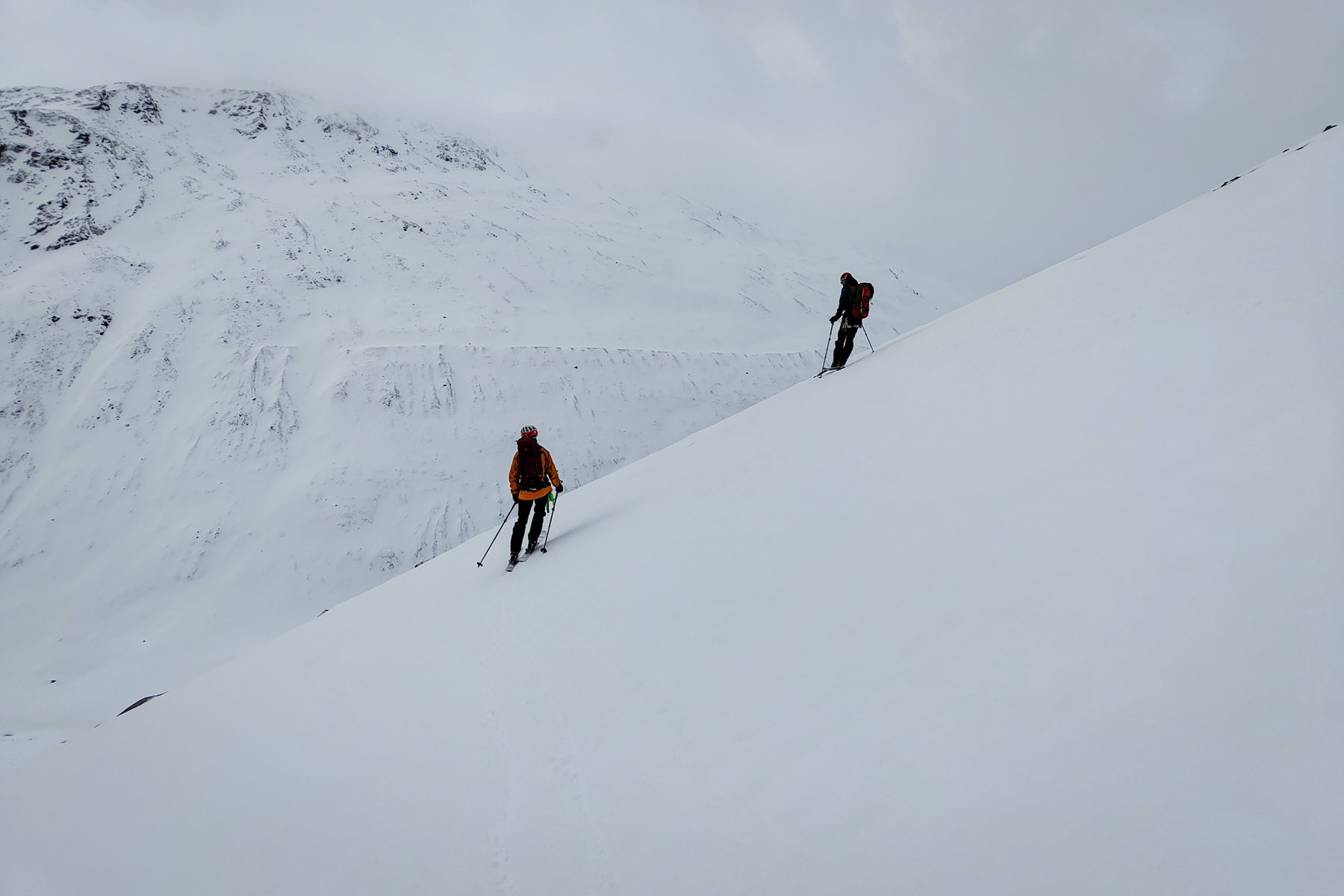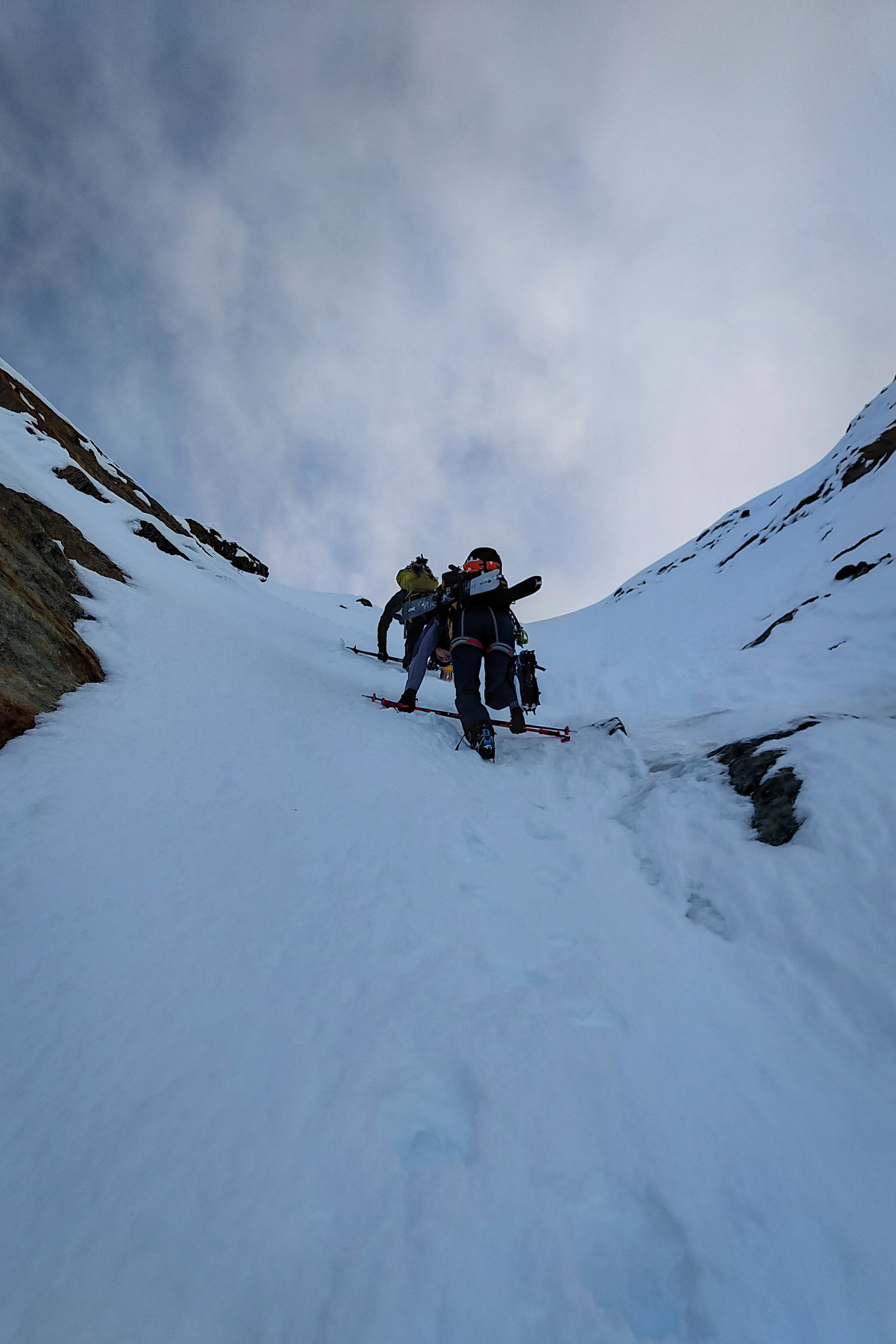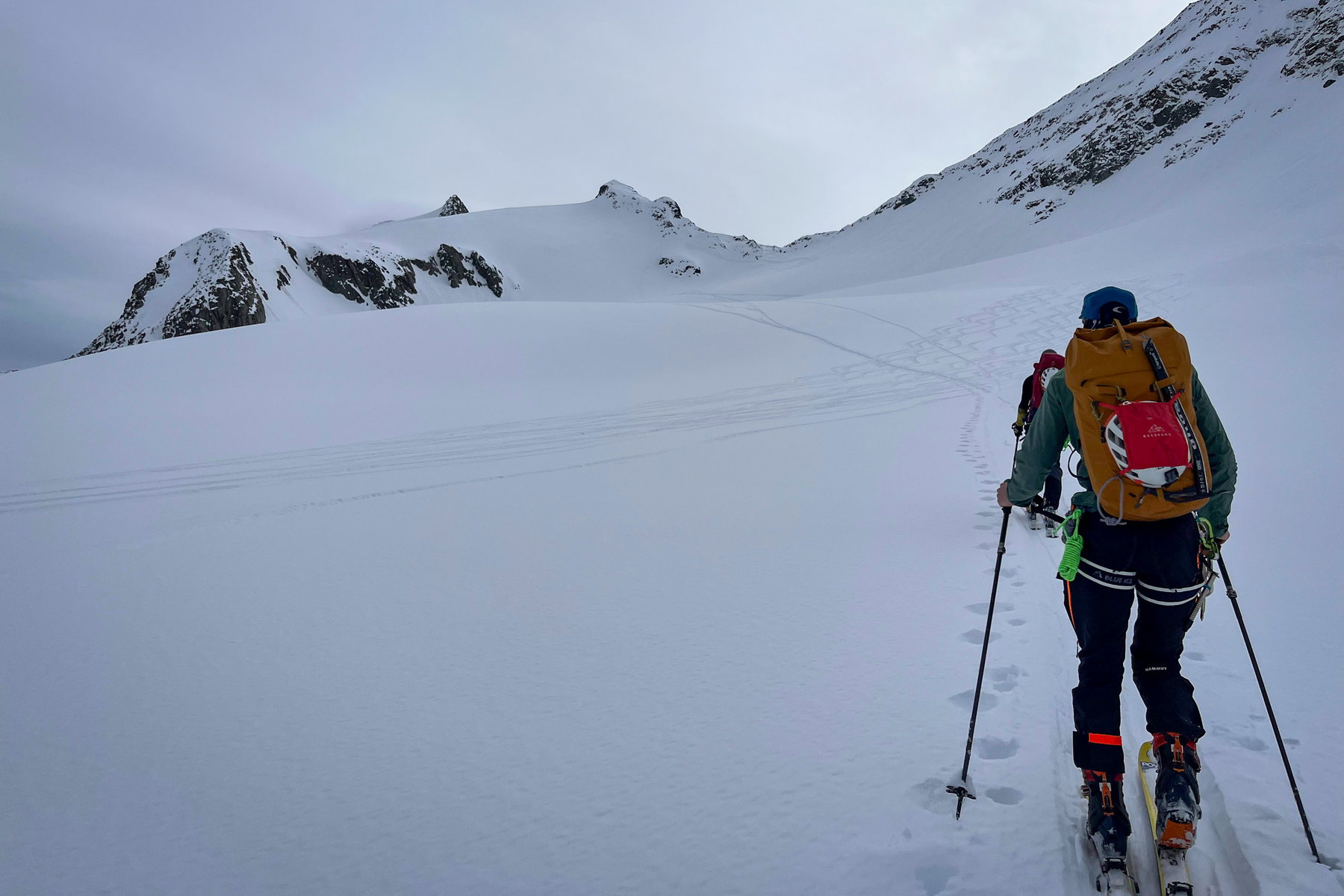 Wir steigen am Guslarferner weiter bis zum Oberen Guslarjoch auf. Das letzte Stück unter dem Joch ist etwas steiler, aber noch gut mit Ski machbar.