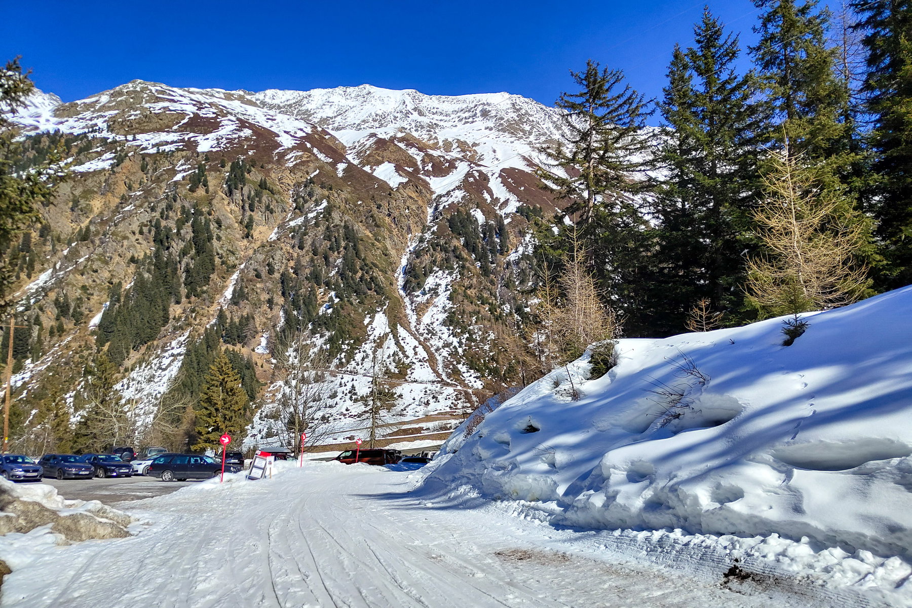 Für mich startet die Tour einige Stunden später ebenfalls bei der Talstation der Pitztaler Gletscherbahnen, allerdings nicht mit der Seilbahn. Bis zur Taschachalpe gehe ich auf der Rifflsee-Talabfahrt, dann nach links auf einer Forststraße über den Taschachbach und das gleichnamige Tal weiter einwärts. Während dem Aufstieg kommen mir unzählige Gruppen entgegen, die von der Wildspitze abfahren. Da war heute einiges los.