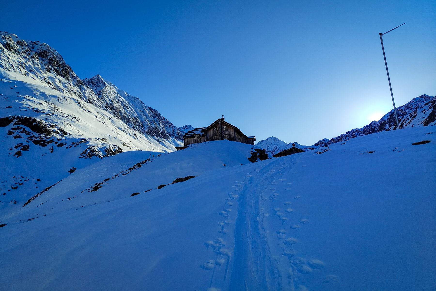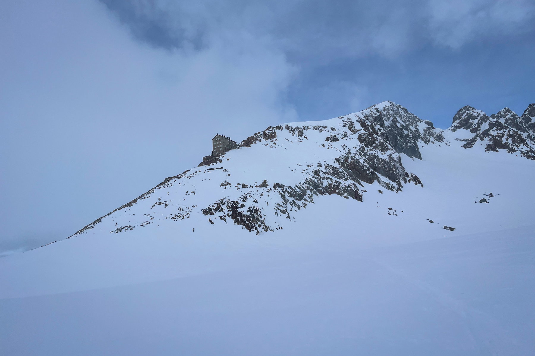 Hinter der Hütte kommt stellenweise noch blau hervor, vorne nur weiß. Fotos: Jakob Roniger, Simon Widy