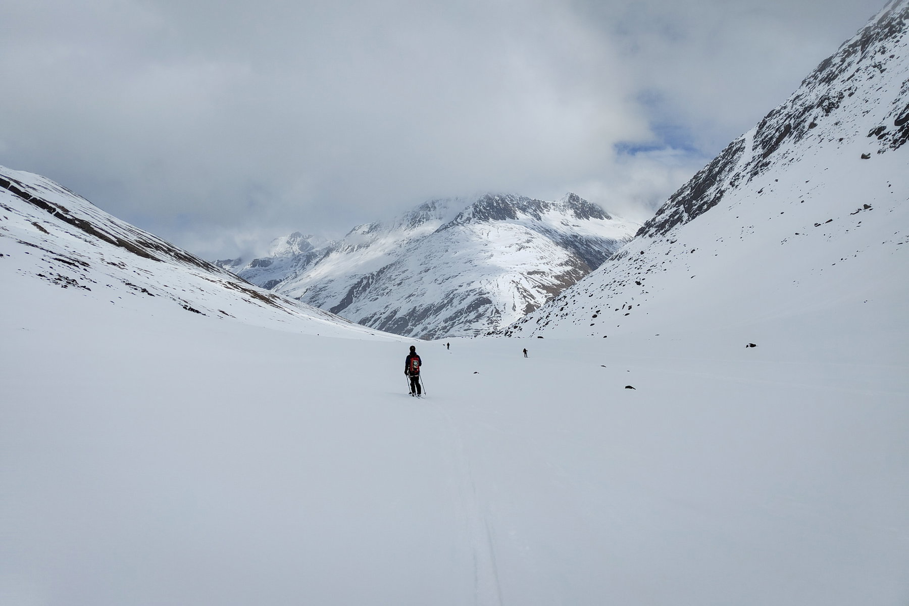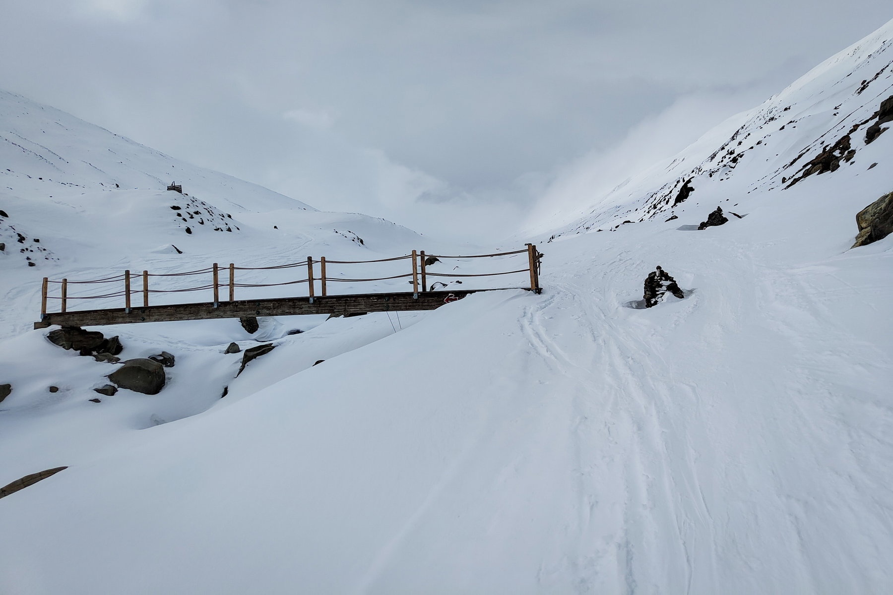 So folgen wir dem GPX-Track hinunter vom Gletscher und fahren bis in das vom Hintereisferner geformte Rofental ab. Trotz der geringen Schneelage finden wir einen Weg und erreichen ohne Abschnallen die Brücke unterhalb vom Hochjochhospiz.