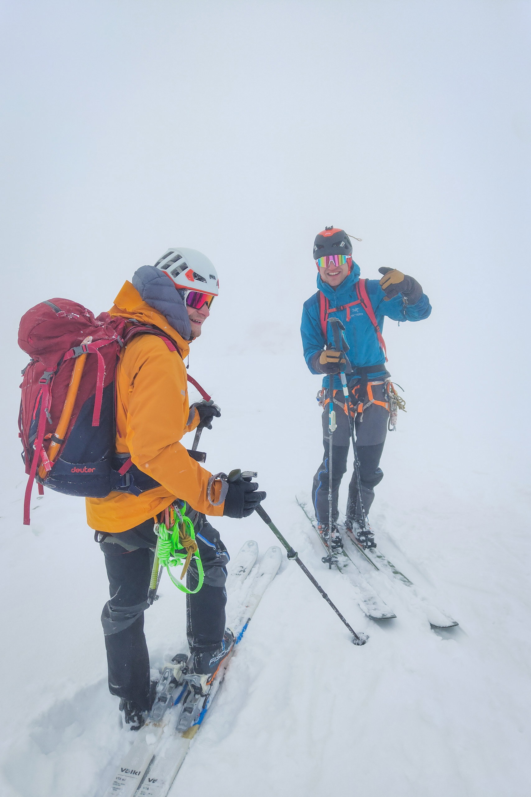 Der dritte Tag gibt wettertechnisch leider nicht das her, was wir erhofft hatten. Mit starkem Föhn ziehen tiefe Wolken auf und schnell entsteht das berüchtigte „Whiteout“. Unseren eigenen Plan, die Weißkugel über den Langtauferer Ferner zu besteigen, verwerfen wir deshalb. Als Alternative entscheiden wir uns dafür, über den Kesselwandferner zum Hochjochhospiz abzufahren, um dann auf das Hauslabjoch aufzusteigen. Über die Ötzi-Fundstelle und die Martin-Busch-Hütte kommen wir schlussendlich nach Vent.