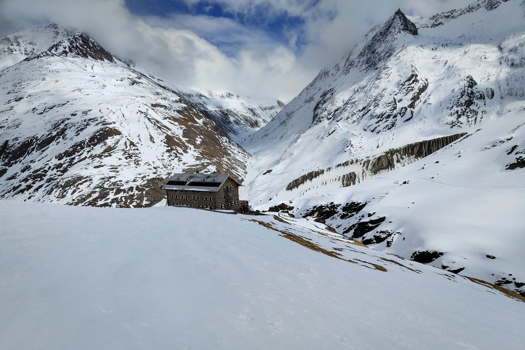 Die letzten Meter vorm Taschachhaus; Das geräumige Winterhaus. Fotos: Simon Widy