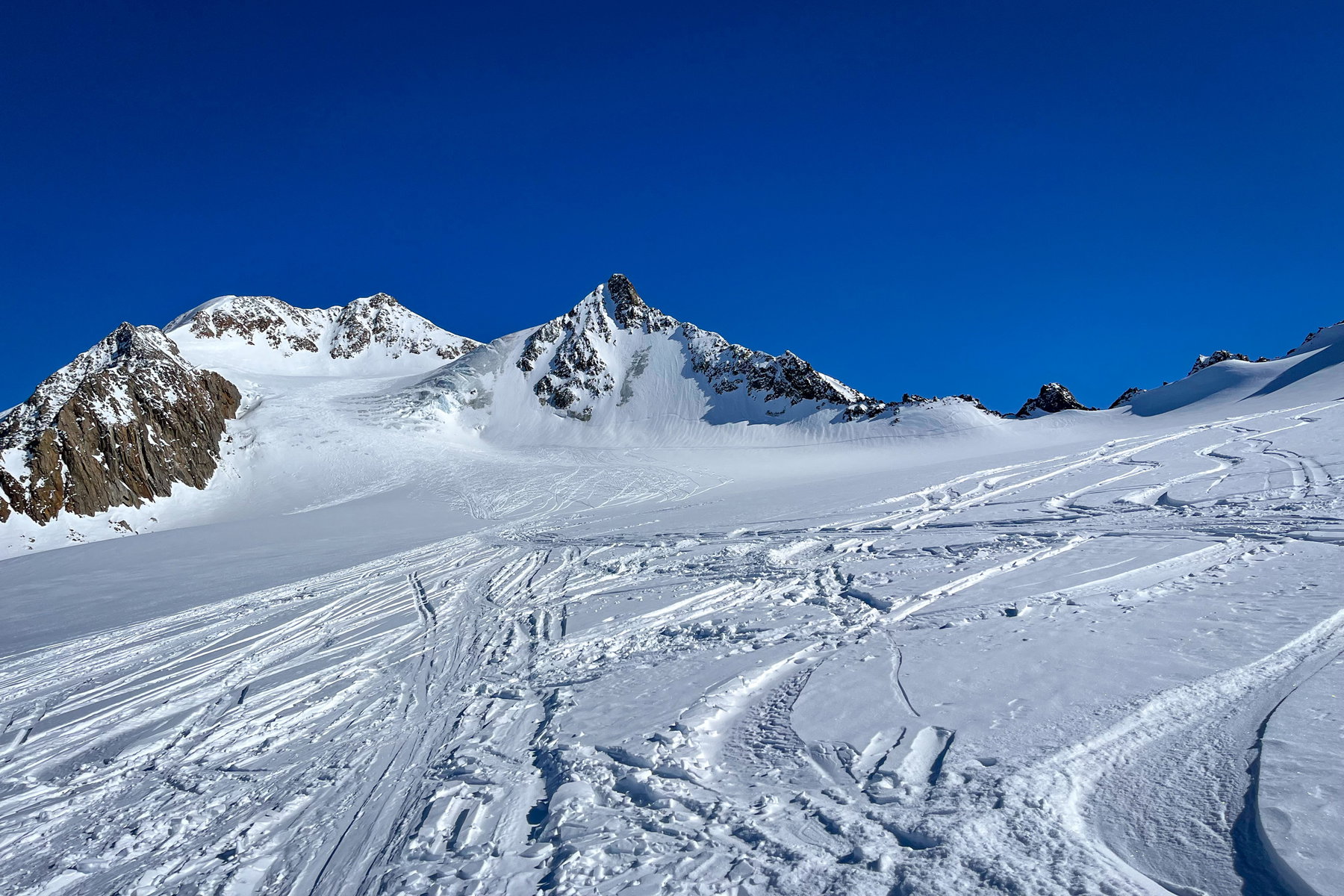 Am ersten Tag wartet mit der Wildspitze bereits der höchste Gipfel der Tour, gleichzeitig aufgrund der Seilbahnnähe vermutlich auch der am stärksten frequentierte Wegabschnitt. Ich muss die Wildspitze heute leider auslassen, da ich am Vormittag noch einen Termin auf der Uni habe. So starten meine zwei Freunde zunächst ohne mich in der Früh in Innsbruck in Richtung Pitztaler Gletscher. Mit der gut gefüllten ersten Gondel geht es aufwärts bis auf über 3.200 Meter. Nach einem kurzen Stück auf der Piste verlässt man am Mittelbergjoch das Skigebiet und fährt auf den Taschachferner ab. Trotz Skigebietsnähe und ausgeprägter Spuren darf man nicht vergessen, dass man sich auf einem hochalpinen Gletscher mit all seinen Gefahren befindet.