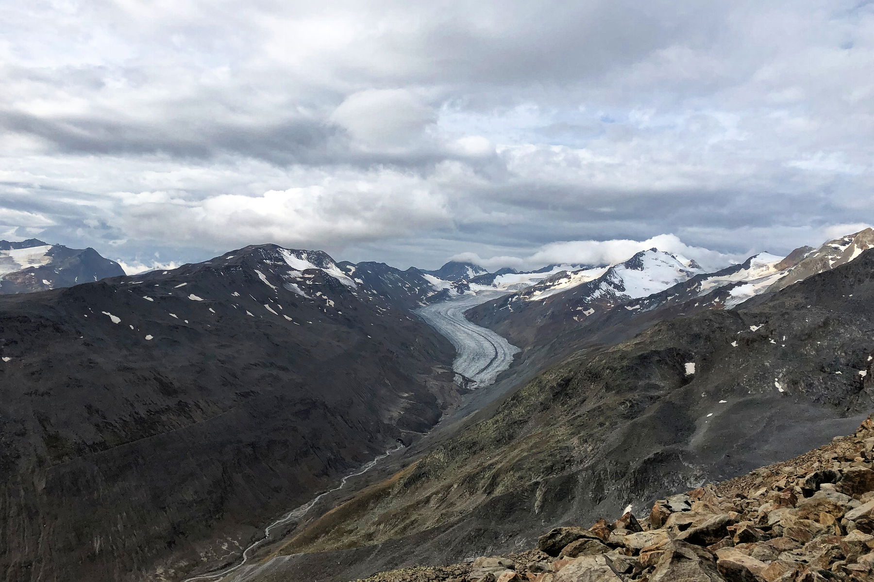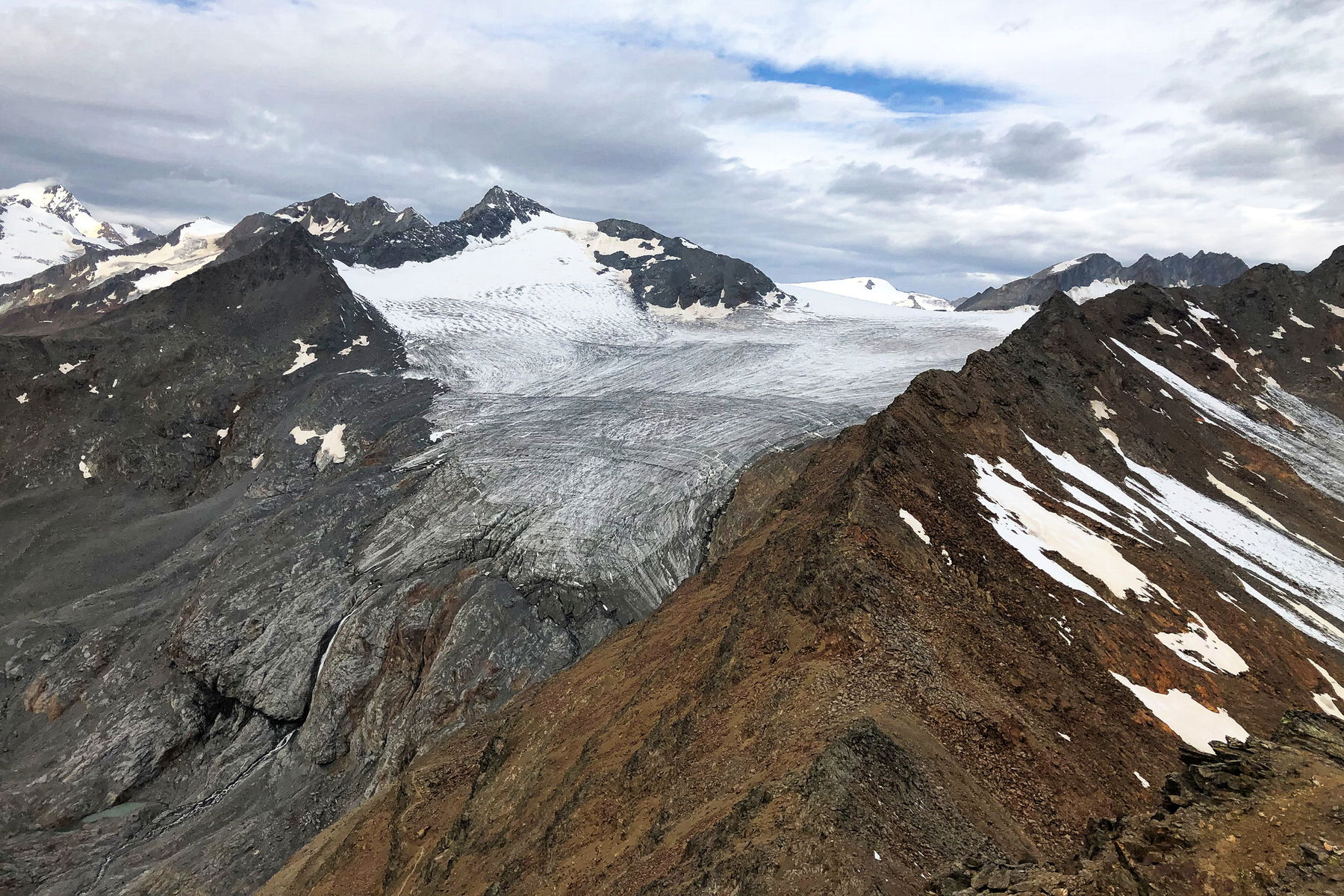 Gefühlt ist es von der Hütte bis auf die Hintere Guslarspitze wirklich nur ein Katzensprung. Das mag daran liegen, dass die Wegstrecke vergleichsweise gering ist. Bald sind wir also oben und genießen das Gipfelpanorama von der 3.147 Meter hohen Hinteren Guslarspitze. Was man da so alles sieht, ist beeindruckend: Sämtliche jämmerlich dahinschmelzende Gletscher, zum Beispiel den Kesselwandferner, die Wildspitze, Tirols höchsten Berg, oder das Tisenjoch, die Stelle an der die Eismumie Ötzi anno 1991 gefunden wurde.