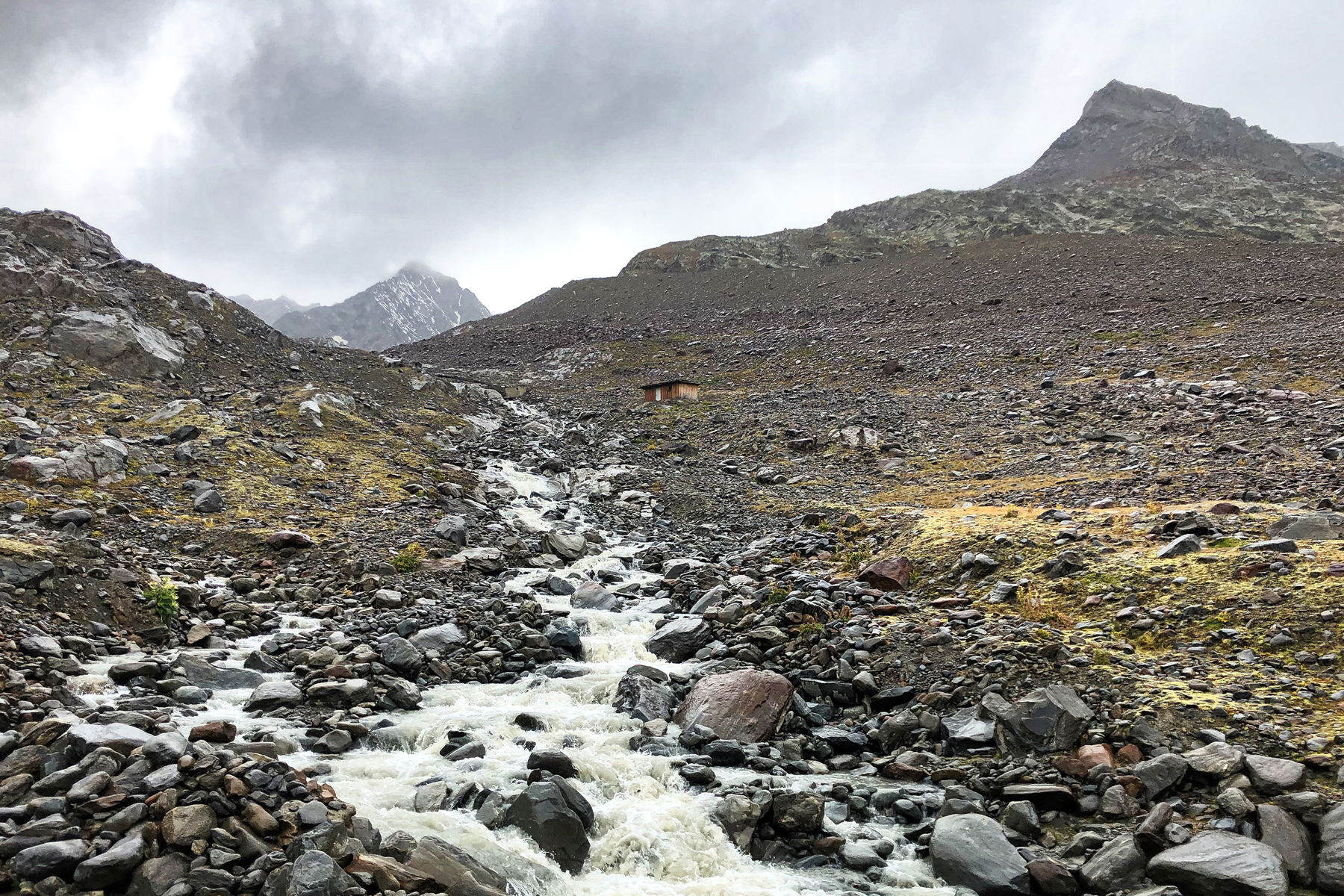 Für den Abstieg wählen wir eine andere Route als für den Aufstieg. Warum sollten wir auch zweimal denselben Weg gehen, wo es hier doch eine Vielzahl an Möglichkeiten gibt?! Zwischen Hinterer und Mittlerer Guslarspitze zweigen wir nun in die andere Richtung ab. Unser nächstes Zwischenziel ist das sogenannte Proviantdepot. Hier wurde – nomen est omen – zu früheren Zeiten Proviant für die Alpenüberquerung deponiert. Heute steht hier eine moderne Wetterstation, die so ziemlich alles misst, was das Herz von Naturwissenschaftler:innen begehrt. Ein guter Ort für eine weitere Pause also – nur ja nicht auf dem “Snow Pillow”, um die Messergebnisse nicht zu verfälschen!