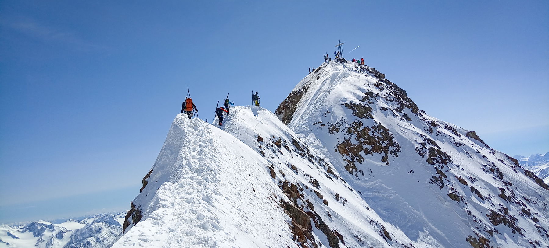 Nach wenigen Metern legen wir bereits die Steigeisen an und steigen über den Nordgrat in einer guten ¾ Stunde zum Gipfel hinauf, wo uns Sonnenschein, aber böiger Föhn erwartet. Über eine Rinne fahren wir wieder zum Sammelpunkt hinab und treffen uns mit den anderen wieder am vereinbarten Sammelpunkt.