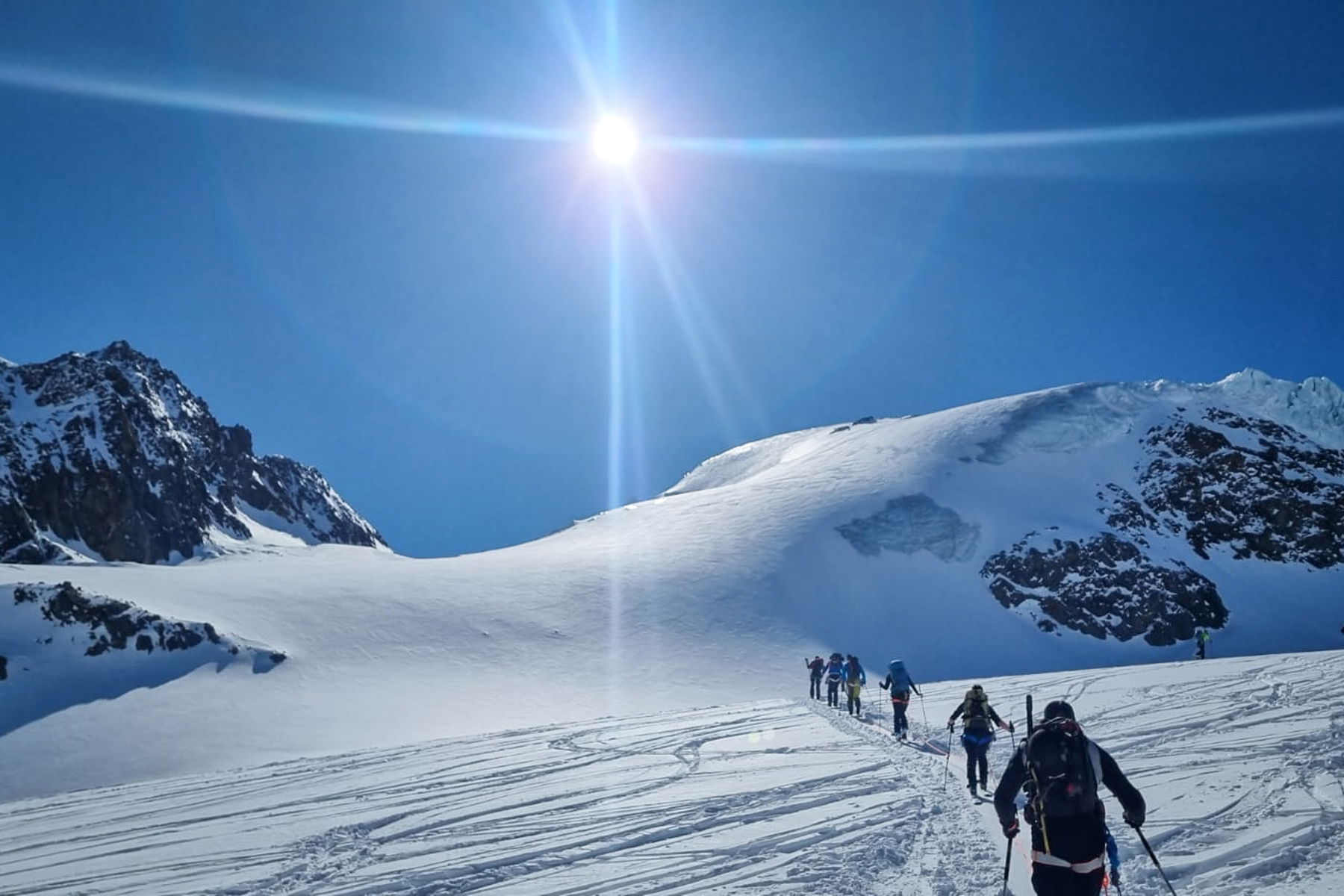 Mit den Skiern fahren wir von hier noch übers Mittelbergjoch ab, fellen dann auf und gehen in der Seilschaft weiter.