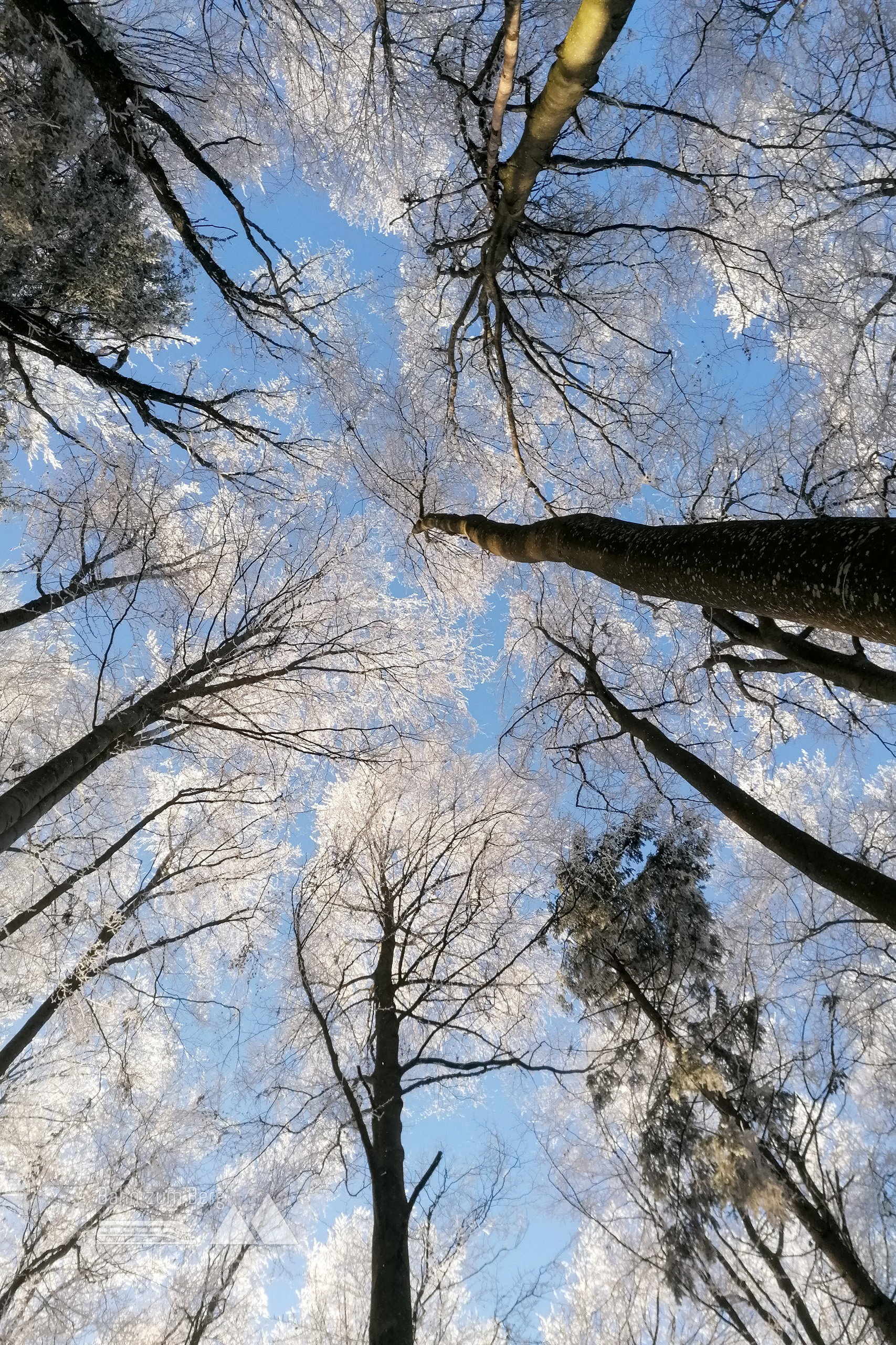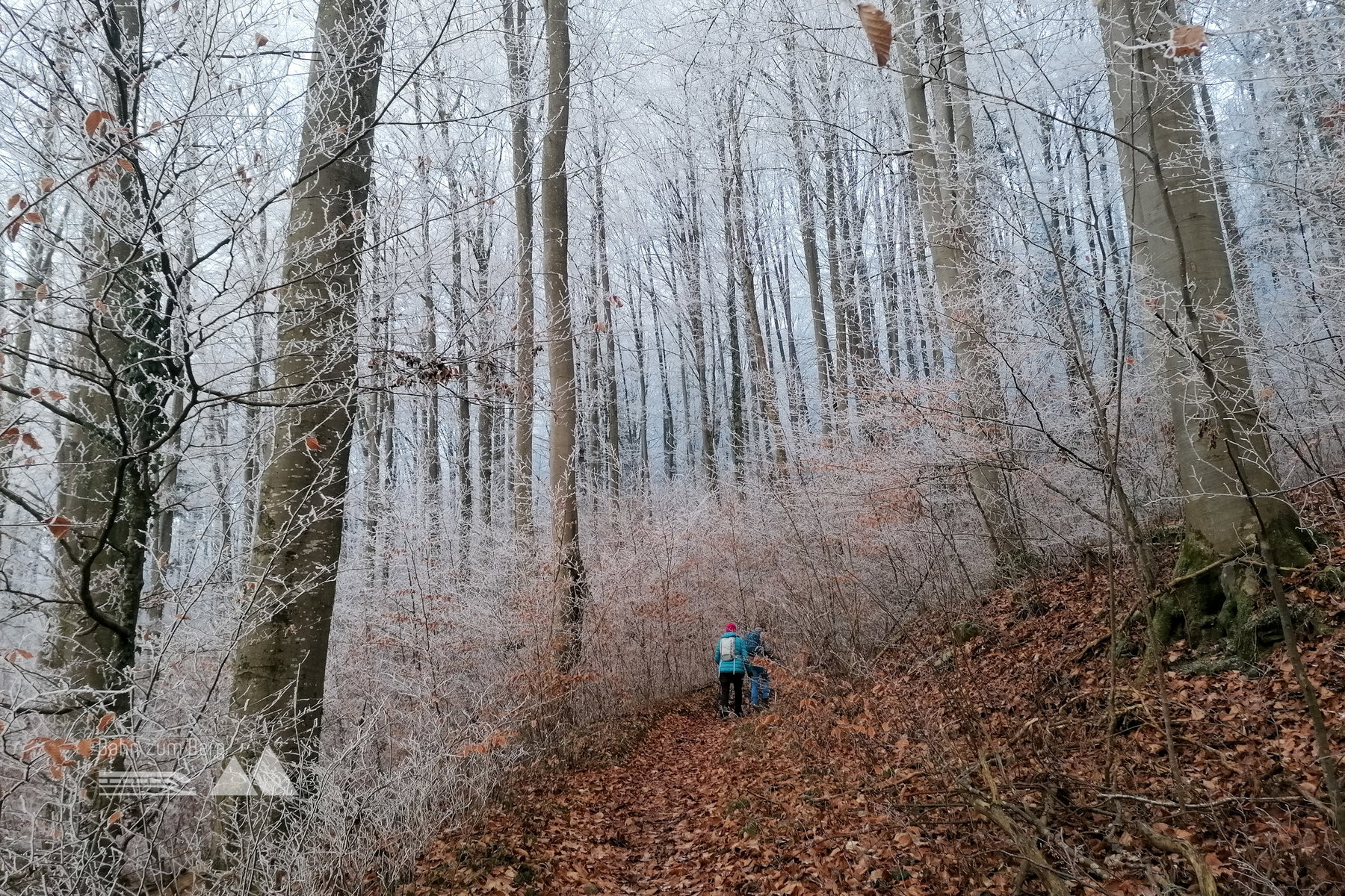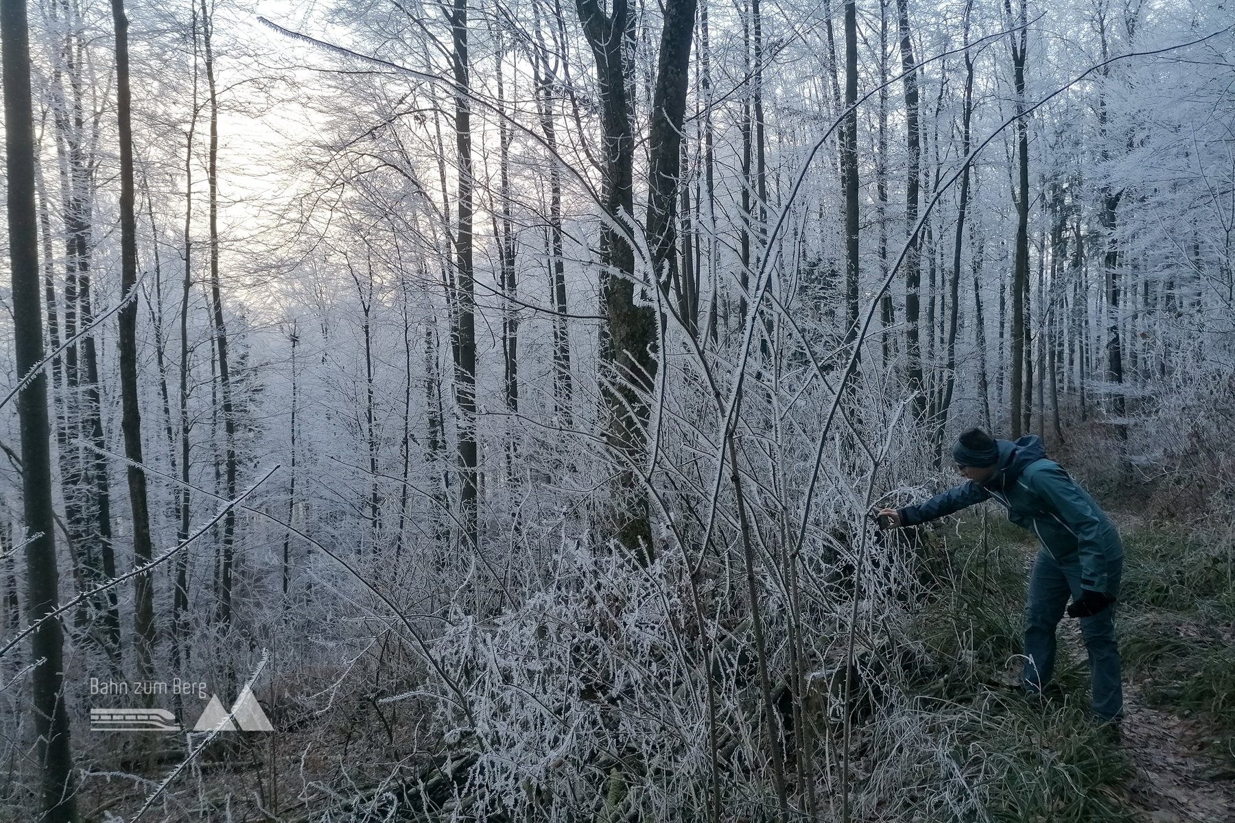 Es geht stetig im Wald bergauf und der Nebel verschwindet – was kommt, ist der Reif auf den Bäumen.