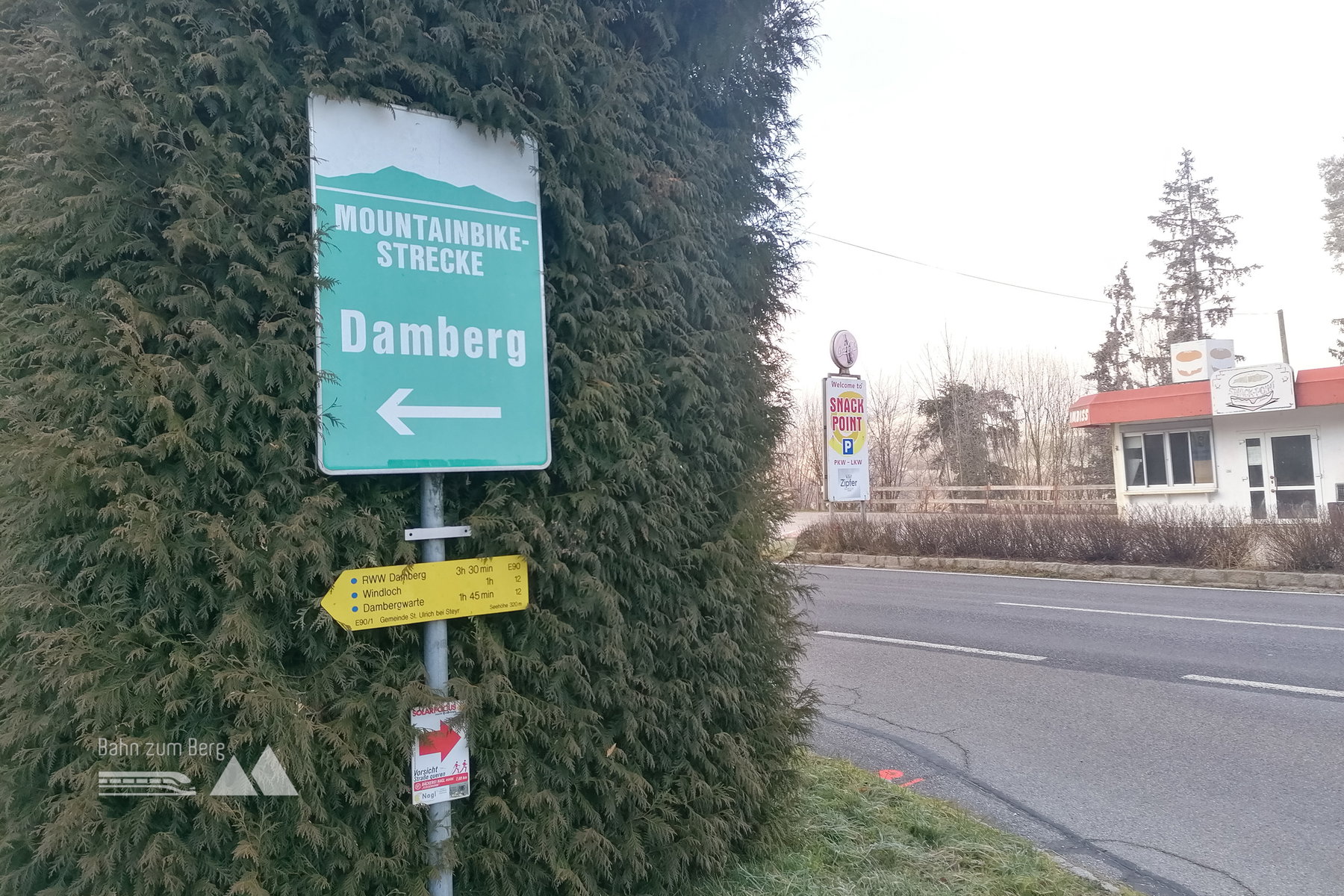 Beim Gasthof Eckhard überqueren wir nochmals die Eisenstraße, um einen der bereits gut ausgeschilderten Wanderwege in Richtung Damberg zu nehmen. Wir orientieren uns hier an der rot-weißen Markierung (übers „Windloch“).