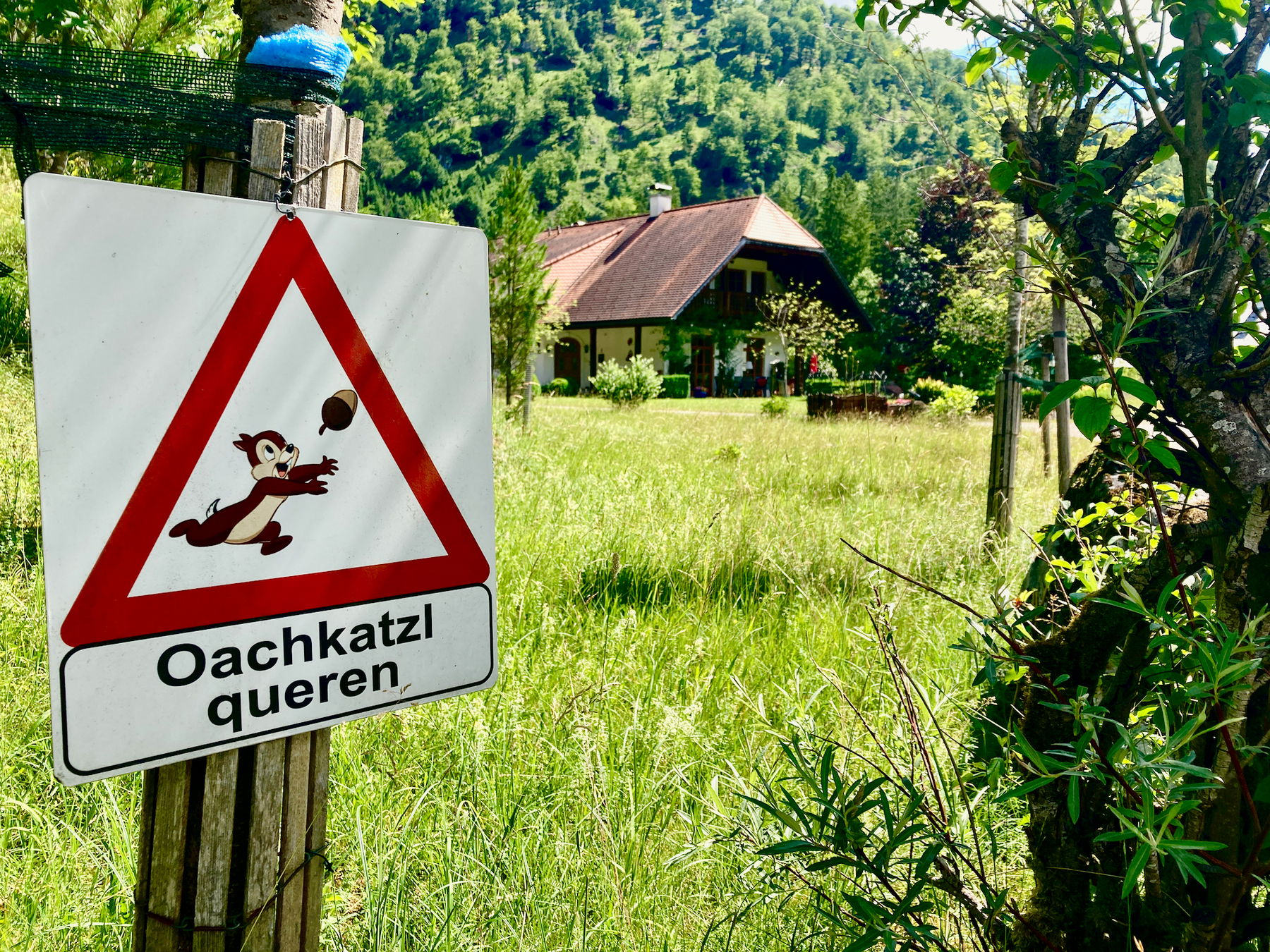 Wenig später ein weiterer freundlicher Hinweis: Obacht auf Oachkatzl (deutsch: Eichhörnchen)! Immer wieder bekommen wir diese Tiere zu sehen. Alle bleiben gesund.