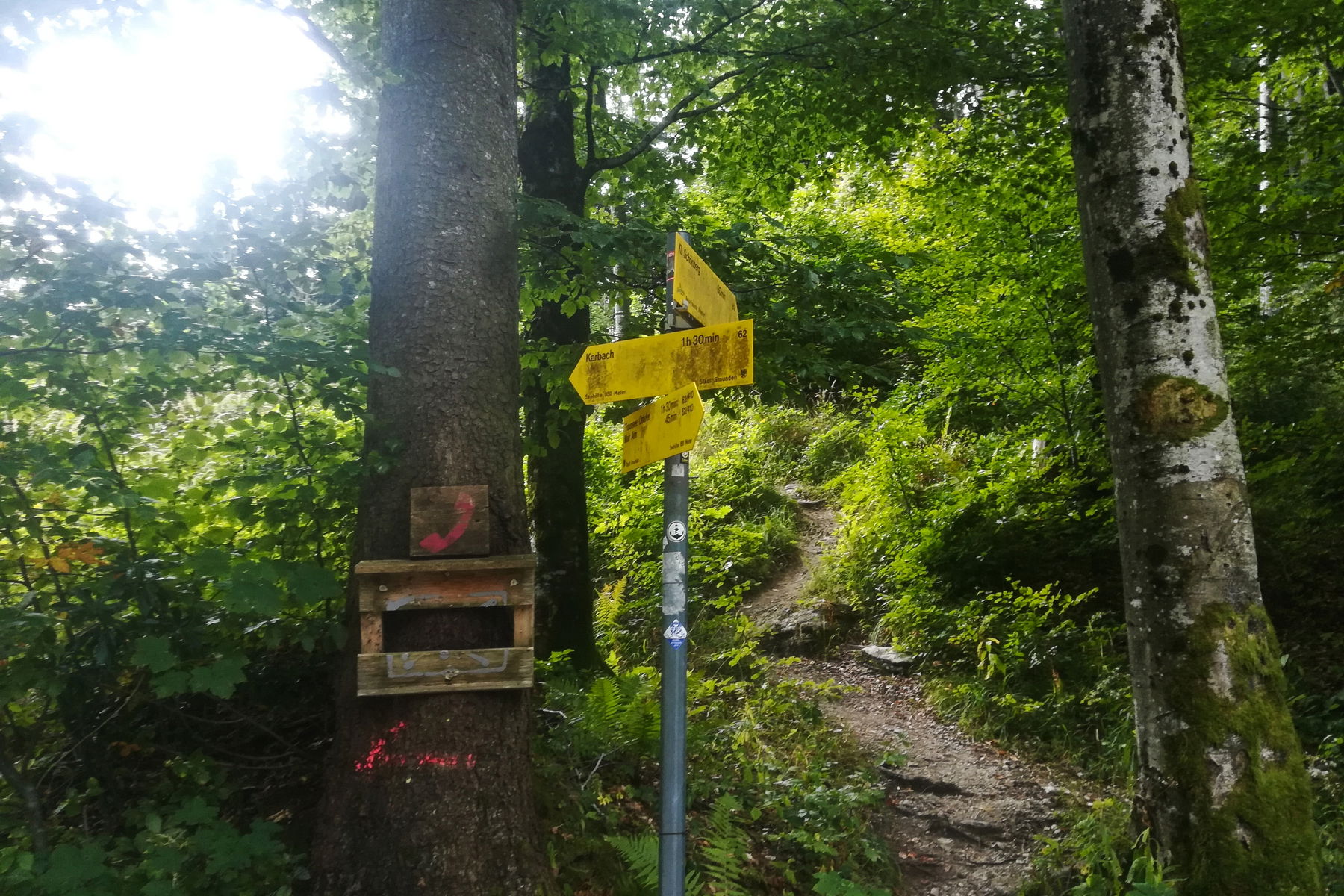 Nach etwa 30 Minuten sind wir am Ende angekommen und es geht über Steinstufen hinauf zur Forststraße und zu der Einstiegsstelle des bekannten Naturfreundesteiges. Wir haben heute jedoch ein anderes Ziel und folgen der Forststraße noch etwas weiter bis uns eine Markierung unseren Wandereinstieg zum kleinen Schönberg anzeigt.