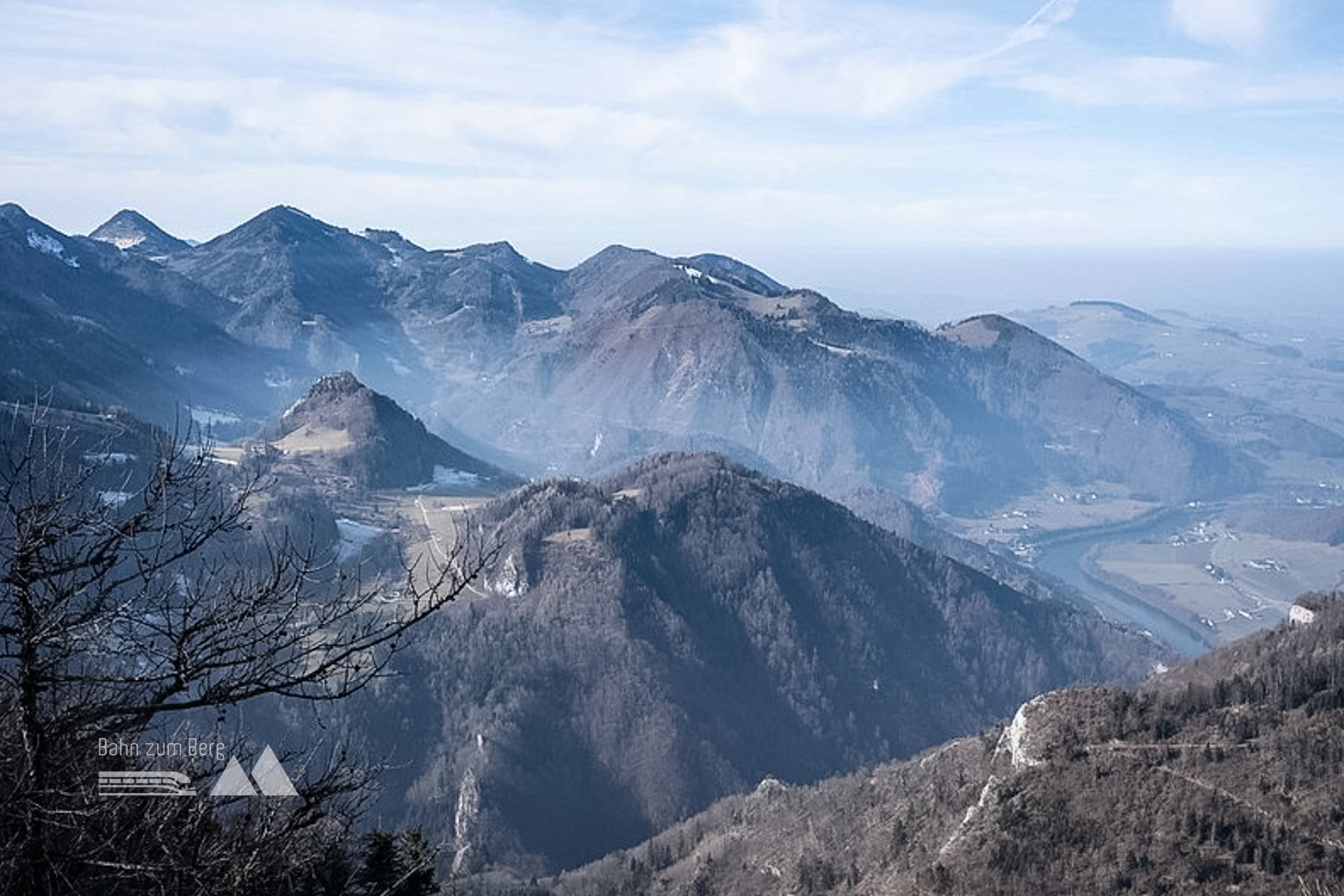 Vom Gipfel hat man ebenso einen schönen Blick hinunter auf die Enns, die sich durch die Landschaft schlängelt.