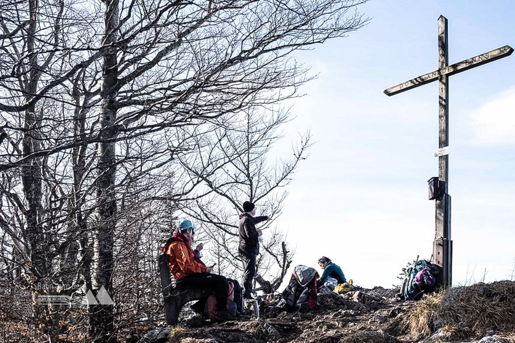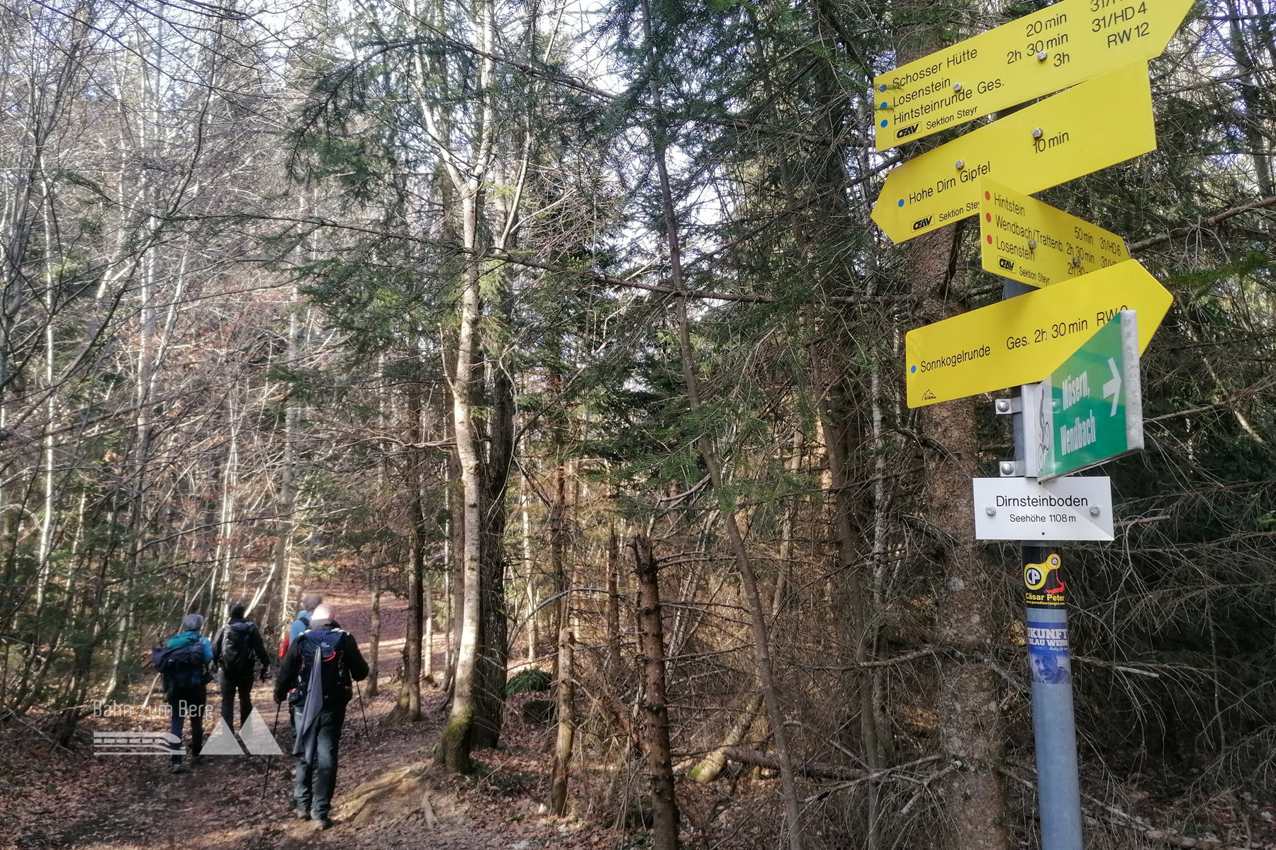 Nach einem weiteren Anstieg und indem wir die Anton-Schosser-Hütte hinter uns lassen, stehen wir auch schon beim Gipfelkreuz der Hohen Dirn (1.134 Meter). Wir jausnen, während wir von der erfahrenen Gruppe über alle möglichen Gipfel und weitere tolle Wanderrouten in der Gegend informiert werden. Super Service ist das heute!