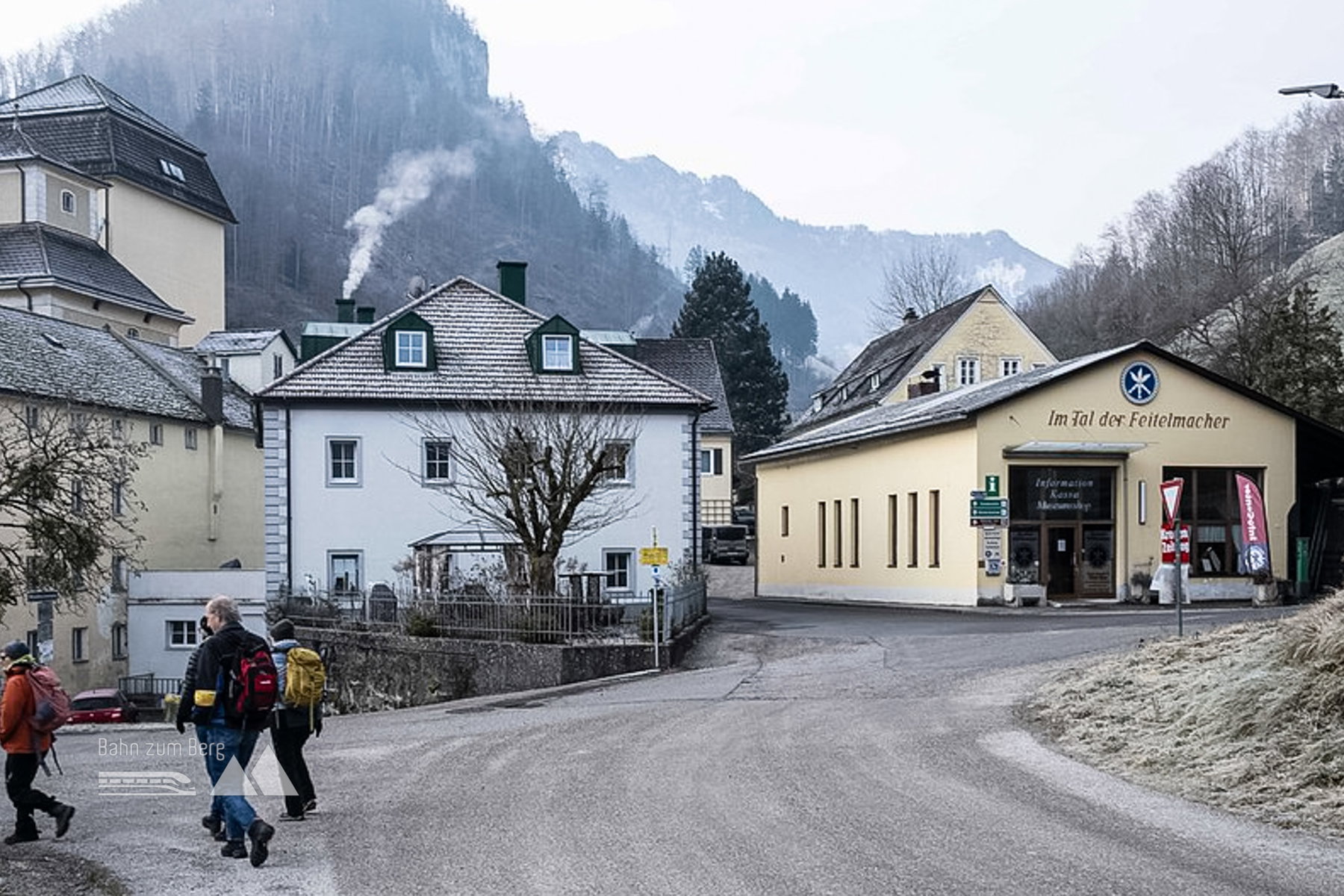 Nun lebt niemand mehr in diesem verlassenen, schattigen Tal. Sonne gibt’s im Winter auch nicht viel. Einer unserer Mitwanderer erinnert sich: „Früher, als das Wendbachtal noch bewohnt war, sind jeden Tag vierzig Wendbacher Kinder zu Fuß in die Volksschule nach Trattenbach gegangen, mehrere Kilometer weit in eine Richtung. Bei Eis, bei tiefem Schnee, bei jeder Witterung.“