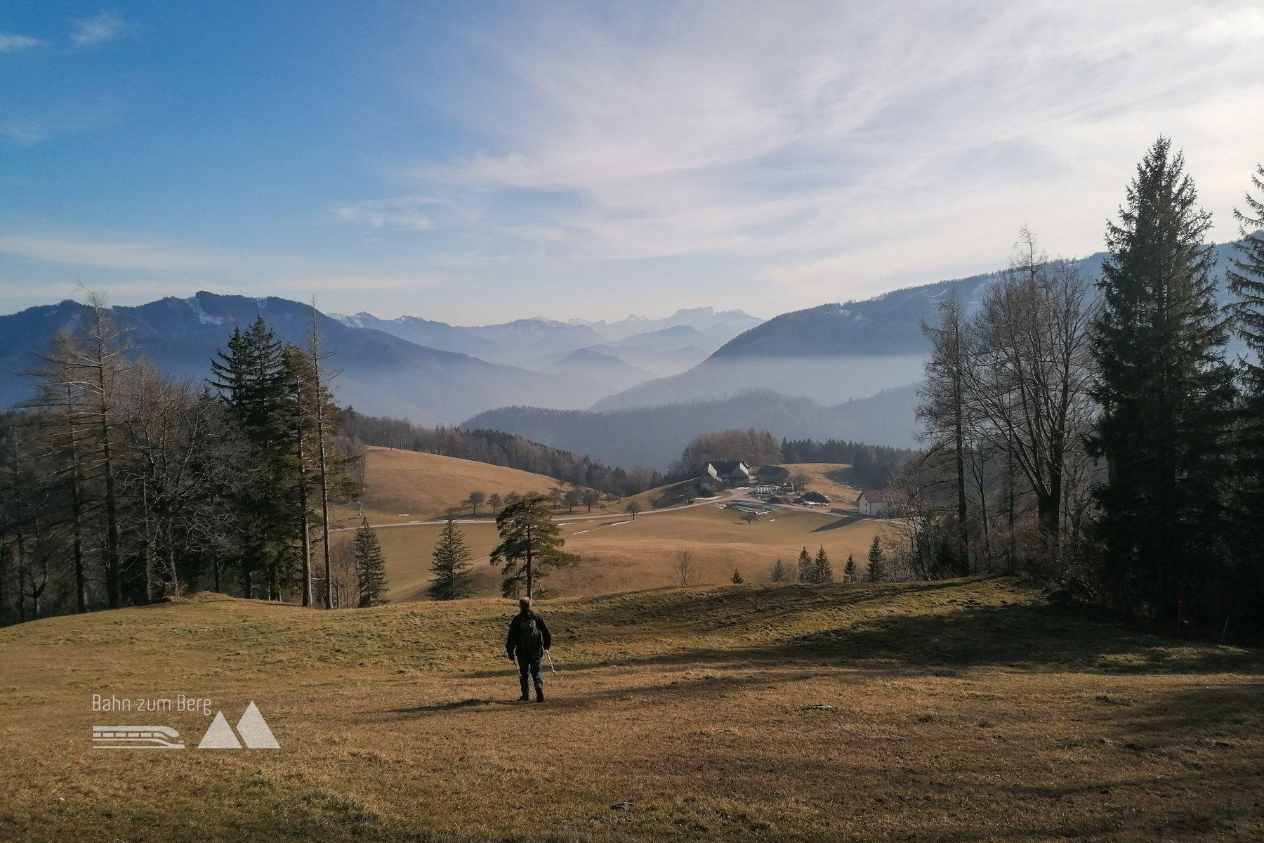 Wir entscheiden uns, die Hütteneinkehr auszulassen und stattdessen nach einer Gipfelpause gleich den Abstieg anzutreten. Ein Wanderskollege verabschiedet sich mit einem kurzen „Ich nehm doch den früheren Zug!“ knapp von uns und saust vor uns den Berg hinunter. Wir nicht. Wir lassen uns Zeit und genießen die wunderbaren Ausblicke auch beim Abstieg – über die weiten Wiesen, die Gipfel der Umgebung. Ins Tal steigen wir über den Steinbachgraben.