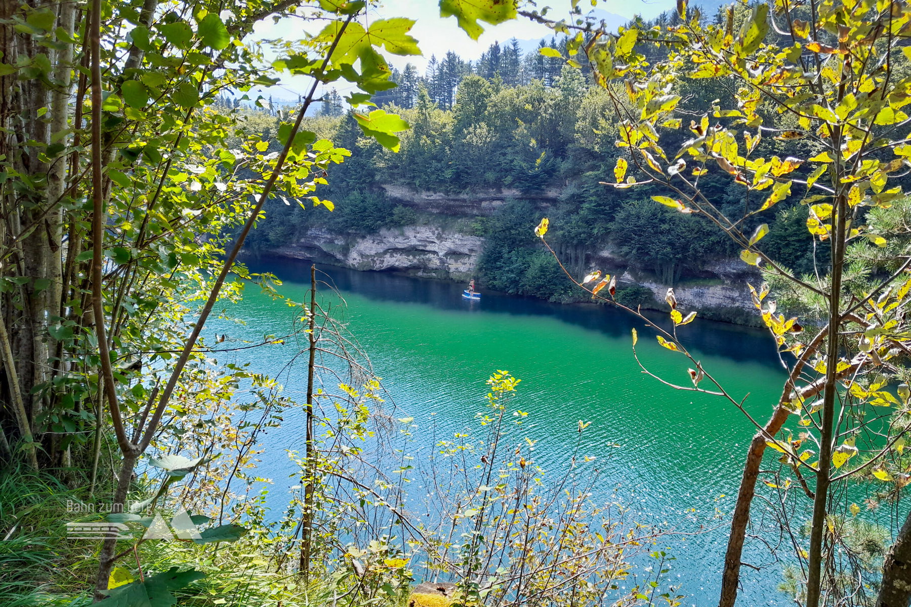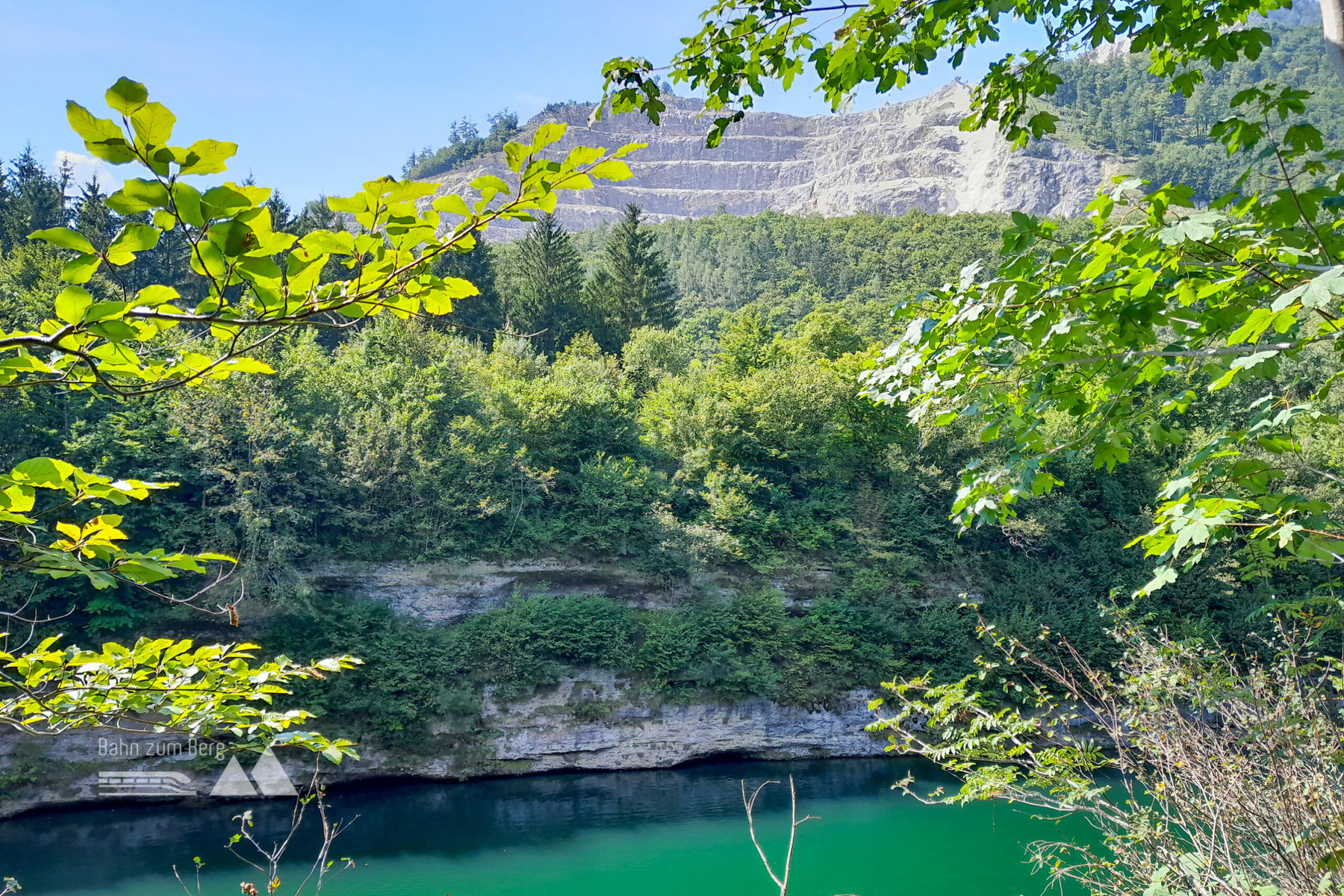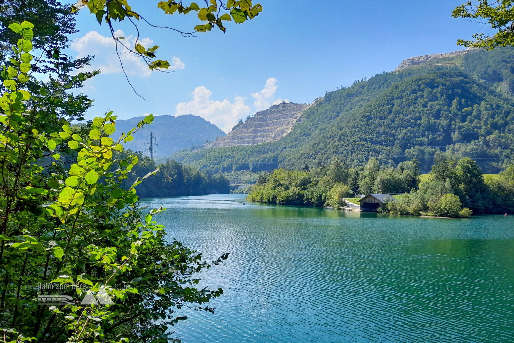 Auf der gegenüberliegenden Seeseite ragt der Steinbruch hervor. Das besondere am Klaus Stausee sind aber dessen eindrucksvolle Konglomeratschichten entlang seines Ufers.