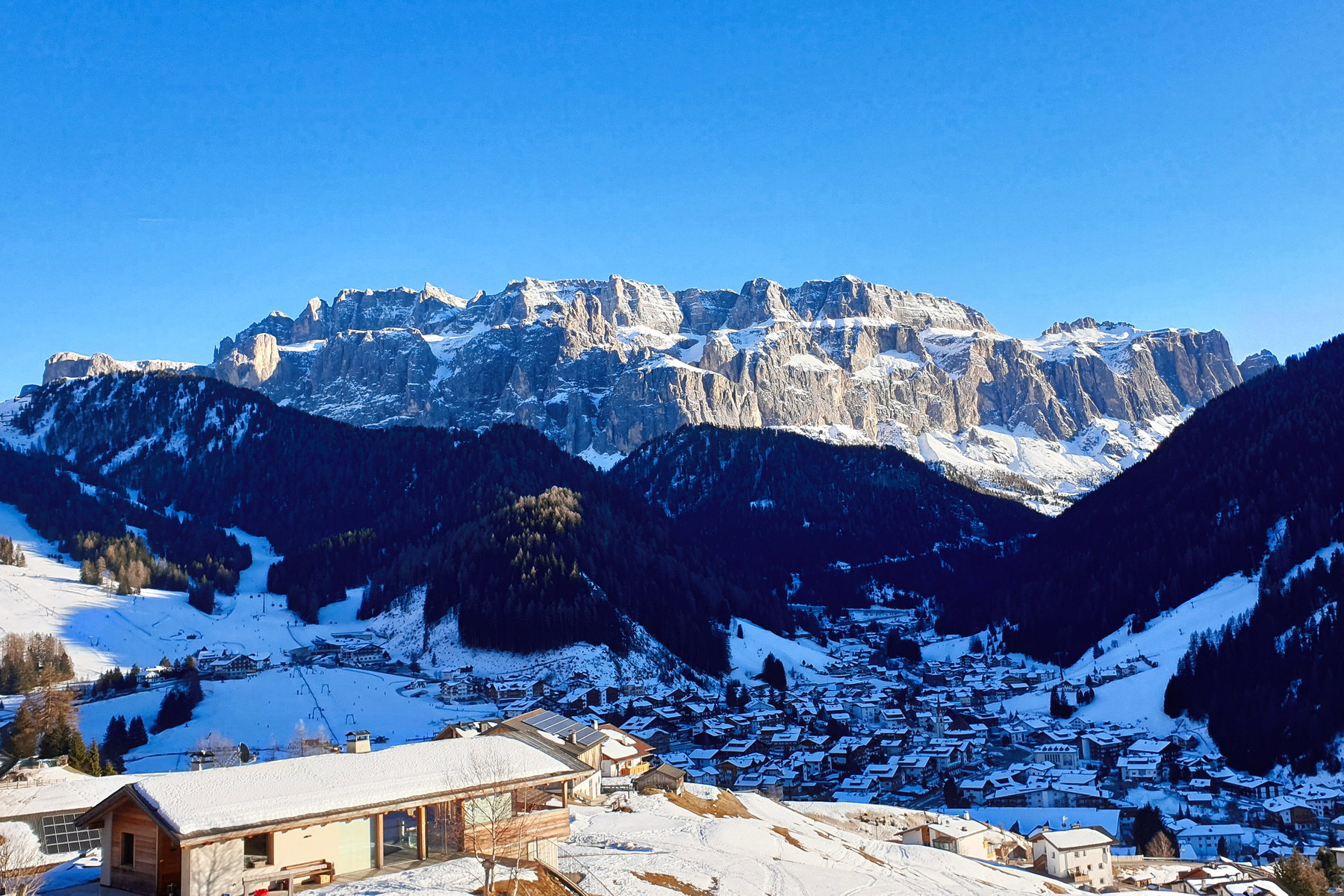 Für den Abstieg folgst du dem beschilderten Weg nach Wolkenstein über die Juac-Alm (1900m). Die Alm ist mit moderner Architektur neu gebaut und liegt traumhaft schön! Sie hat im Winter geöffnet, hier kannst du dich aufwärmen, sonnen und kulinarisch verwöhnen lassen, ehe du nach Wolkenstein (1550m) zum Bus absteigst.