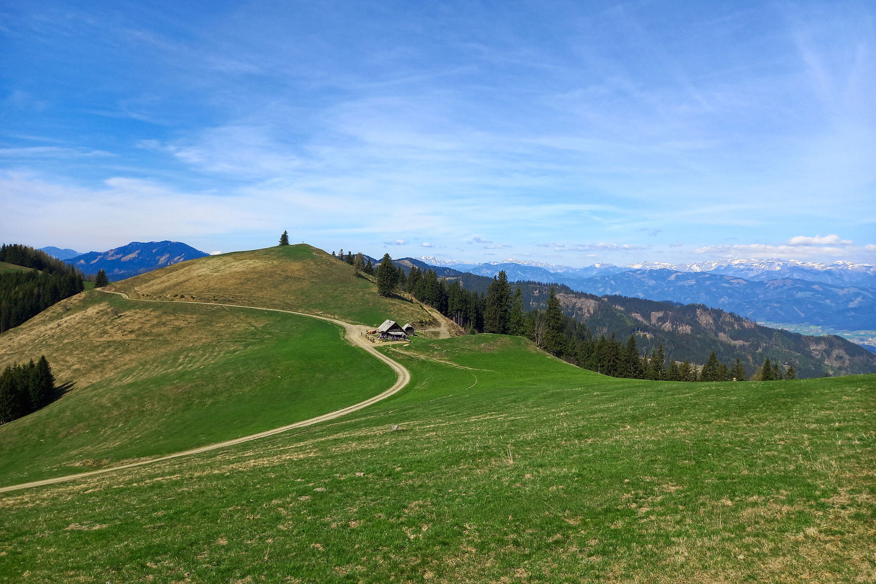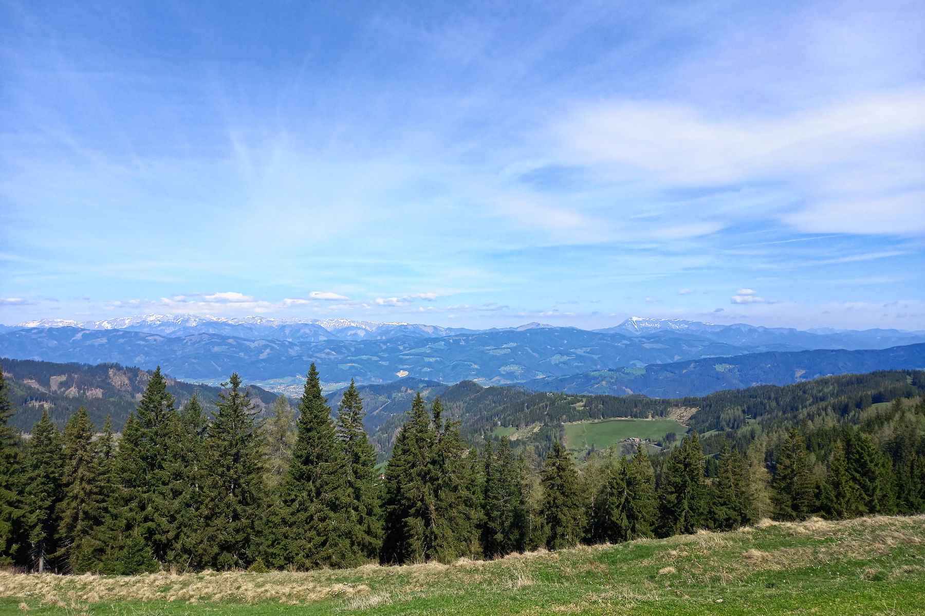 Von der Hofbauerhütte steige ich nun direkt über die Wiese (im Winter fein mit Tourenski) zum Ebenschlag und in stetem Auf und Ab weiter zum Hochschlag. Ich freue mich über die schönen Ausblicke zum Hochlantsch, zum Rennfeld und auf der anderen Seite zum Hochschwab, zur Veitsch und zum Reiting. Auf dem gleichen Weg geht es für mich zurück zum Eibeggsattel. Von dort genieße ich eine feine Abfahrt über die Breitenau nach Mixnitz, meinem heutigen Zielbahnhof.