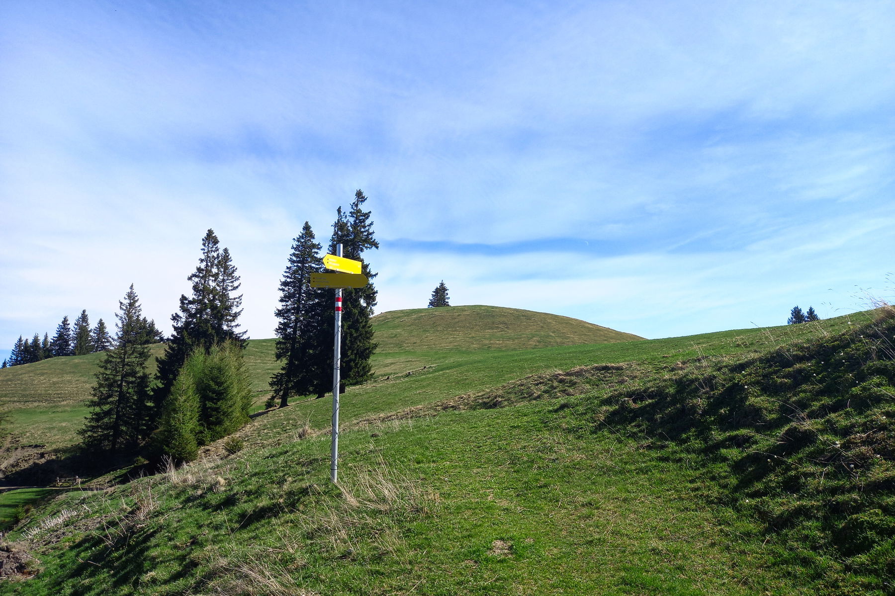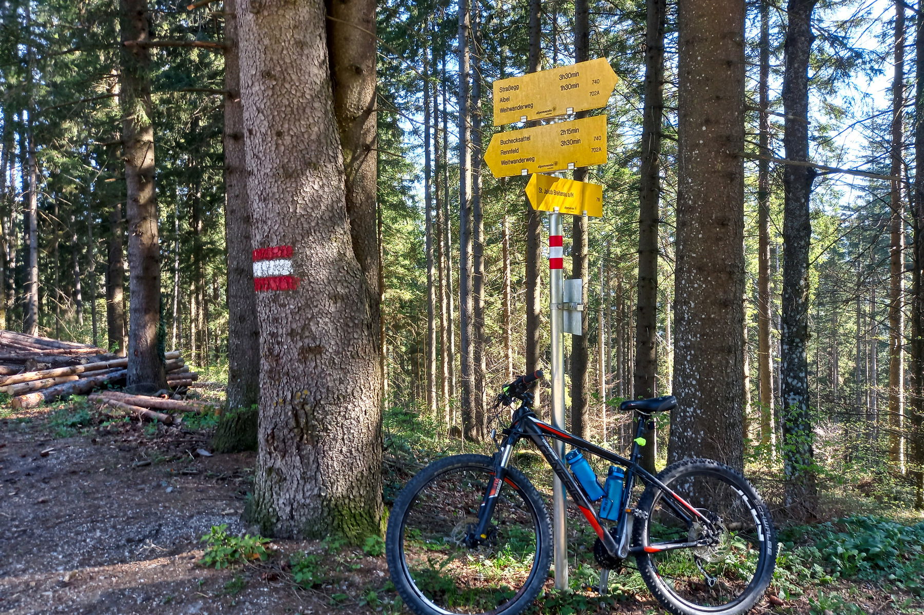 Weiter geht es durch Wald und über Wiesen und über längere Forststraßenabschnitte zum Aibel (zweiter Gipfel, diesmal ohne Kreuz). Etwas unterhalb des Aibels liegt die Hofbauerhütte, bei der ich einige (E-)Biker*innen treffe. Irgendwo zwischen Eibeggwirt und Eibeggsattel soll es eine (geduldete) Forststraßenroute geben – eine durchaus überlegenswerte Variante für das nächste Mal.