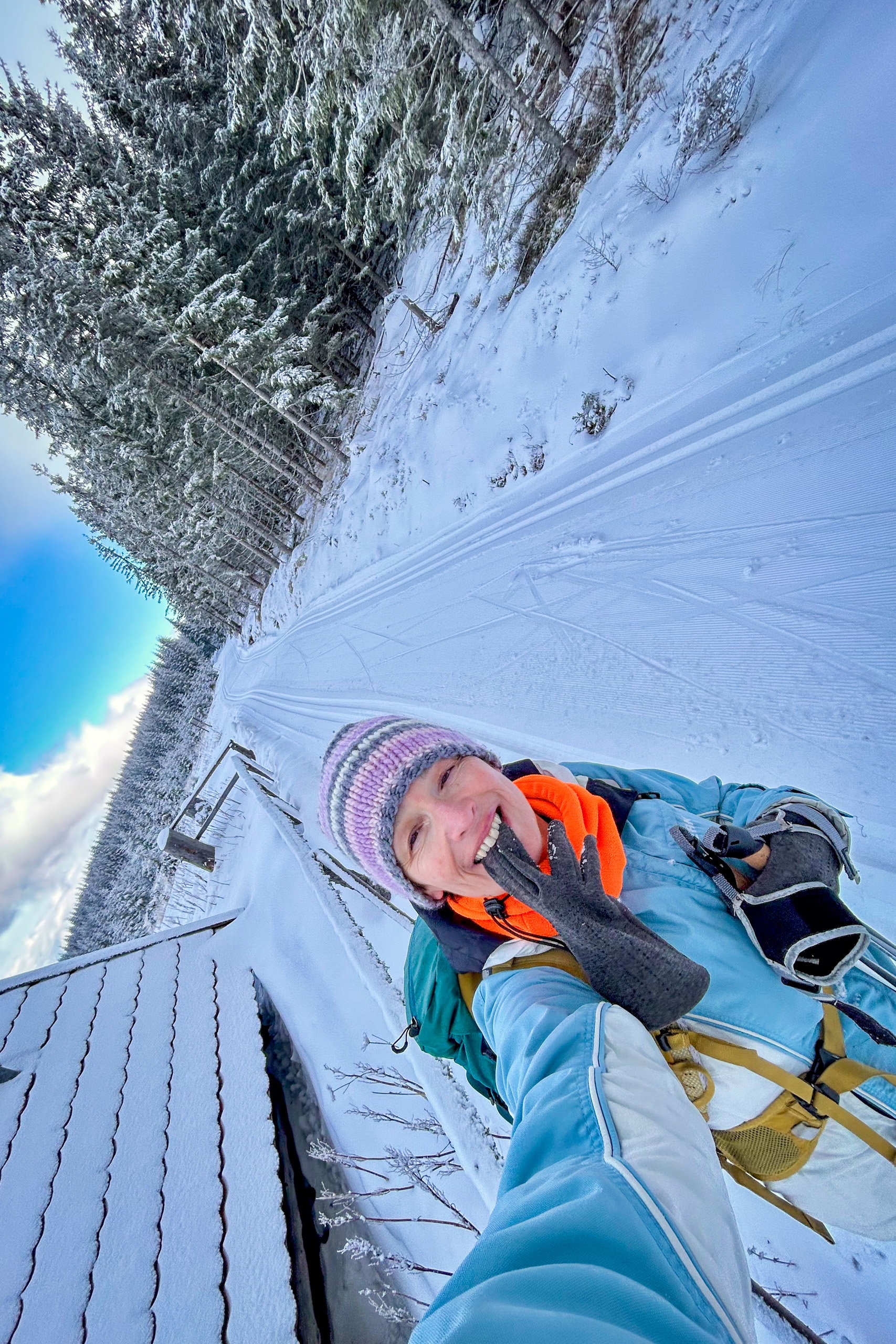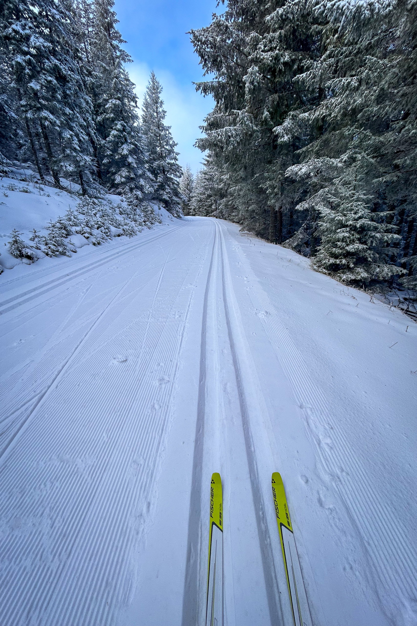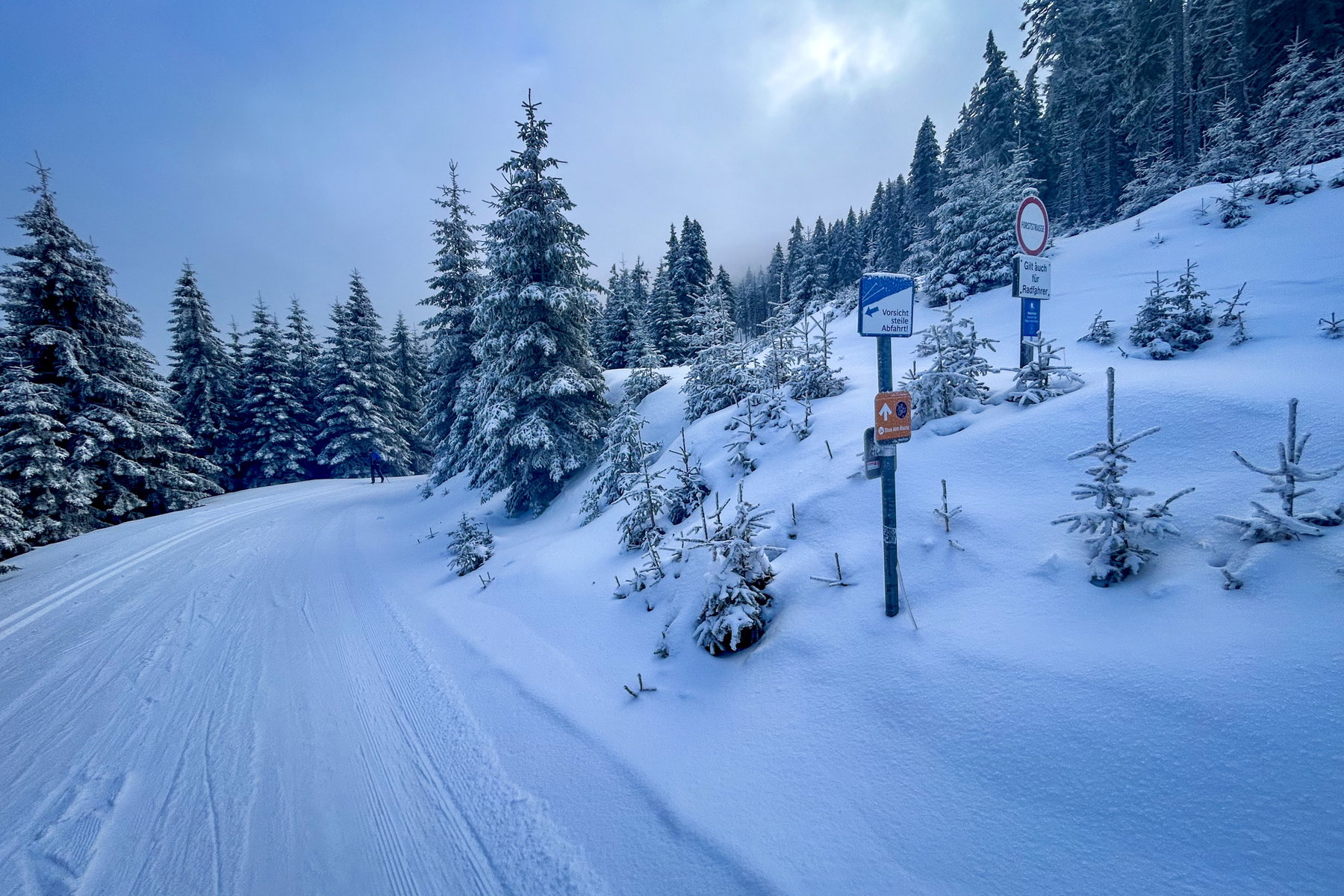Heute sind die Loipenbedingungen „sehr gut“, der Naturschnee frisch präpariert und fährt sich sehr angenehm. Die Loipe ist anfangs leicht wellig und in der zweiten Hälfte dann mehr bergauf als bergab. Zuerst genieße ich das, aber dann kommt mir doch ein Gedanke: „Ich muss da wieder runter!“ Und für Langlaufanfänger:innen wie mich ist das Abfahren schwieriger als das Bergauffahren.