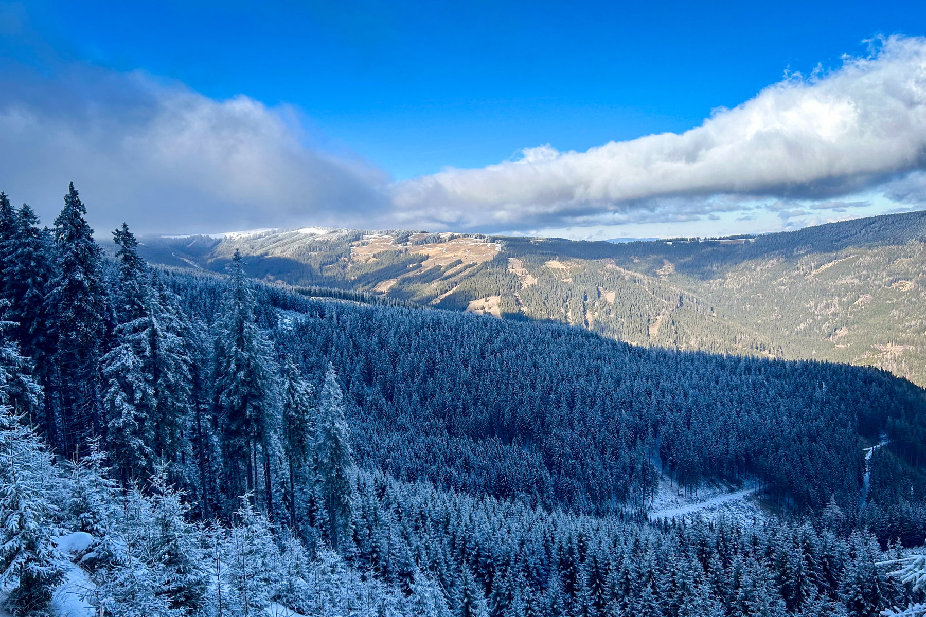 Das Wetter wechselt andauernd und manchmal geben die Wolken die Sonne und einen schönen Blick ins Tal und zu den umliegenden Kuppen und Gipfeln frei.