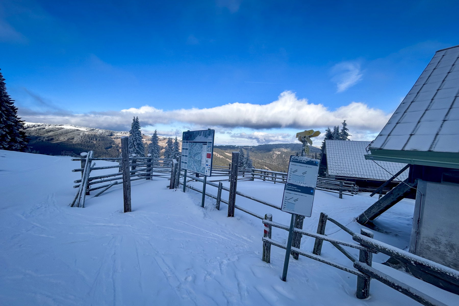 Vier Stunden Zeitfenster bis zum übernächsten Bus passen für mein Vorhaben genau. Ich spaziere von der Bushaltestelle eine schmale Asphaltstraße entlang bis zum Sessellift. An der Kassa besorge ich mir ein Kombiticket für die Berg- und Talfahrt und die Loipengebühr (24,90 € Stand Februar 2026). Zehn Minuten später steige ich bei der Bergstation vom Lift und in meine Skier. Die Loipe beginnt unterhalb der Bergstation beim Speicherteich.