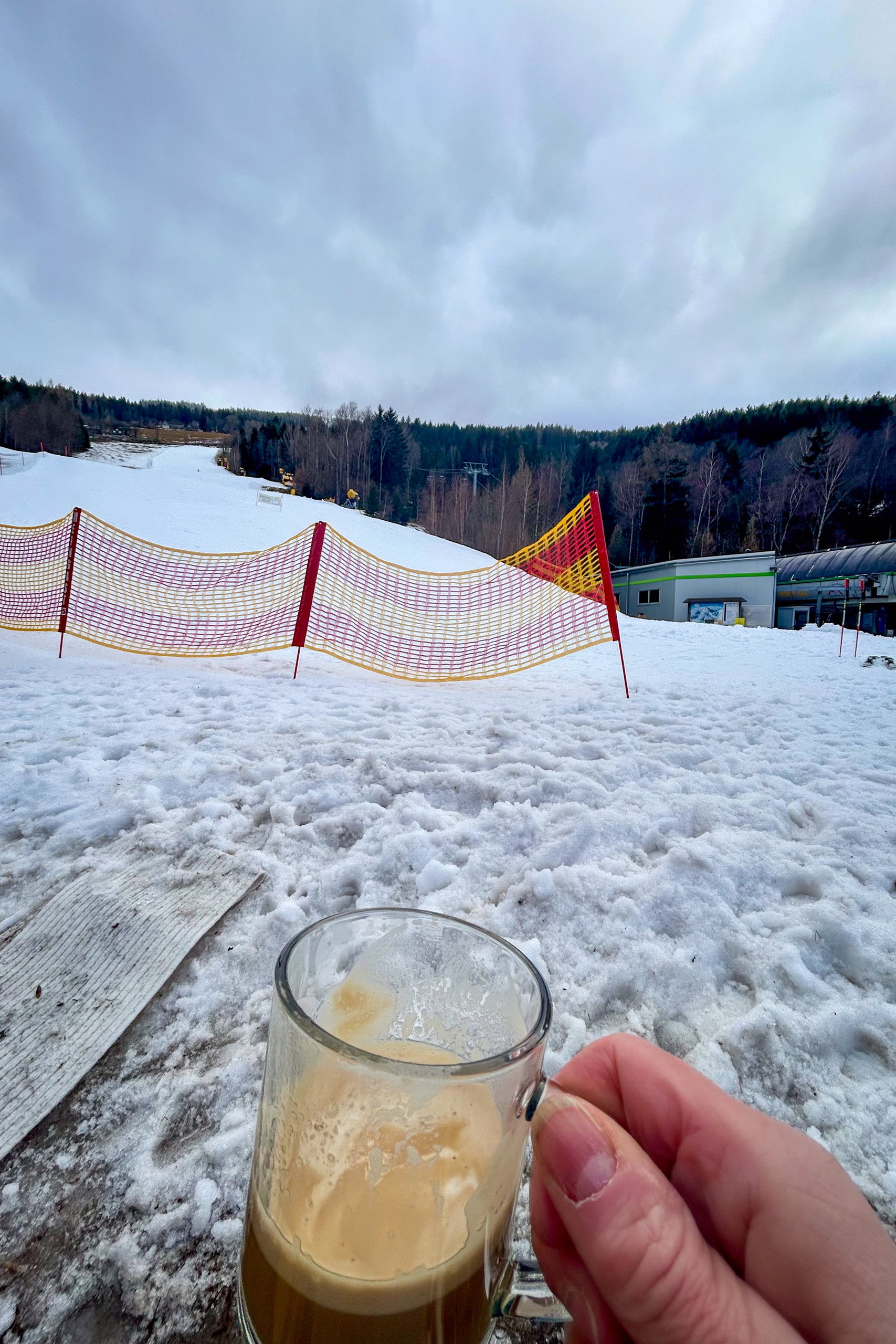 Ich fahre mit dem Sessellift runter und hol mir dann eben beim Standl am Ende der Skipiste einen Kaffee. Die Tiroler Aprés-Ski-Marschmusik dröhnt ein bissl in meinen Ohren, aber tapfer trinke ich meinen Kaffee im Liegestuhl und lausche einem Herren, der die Angst vor dem ehelichen Nudelwalker wegen seiner nächtlichen Eskapaden besingt. Nein, kein DJ Ötzi – Song. Aber doch irgendwas mit Lederhosn. (Sag mir Danke für den Ohrwurm.)