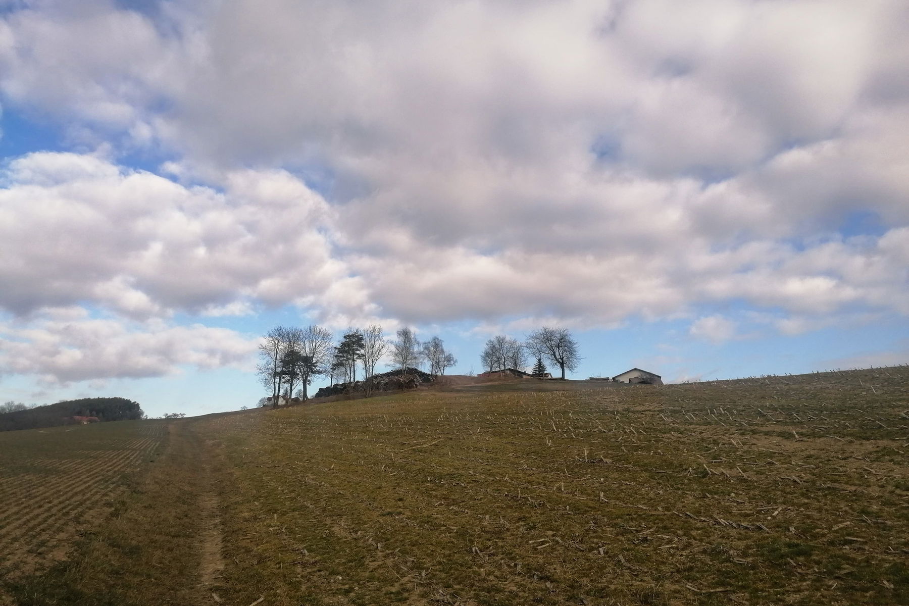 Sobald ich oben auf der Anhöhe am Wald entlangwandere, bin ich schon wieder voll zufrieden: Ich sehe nämlich die Sonne und blauen Himmel.