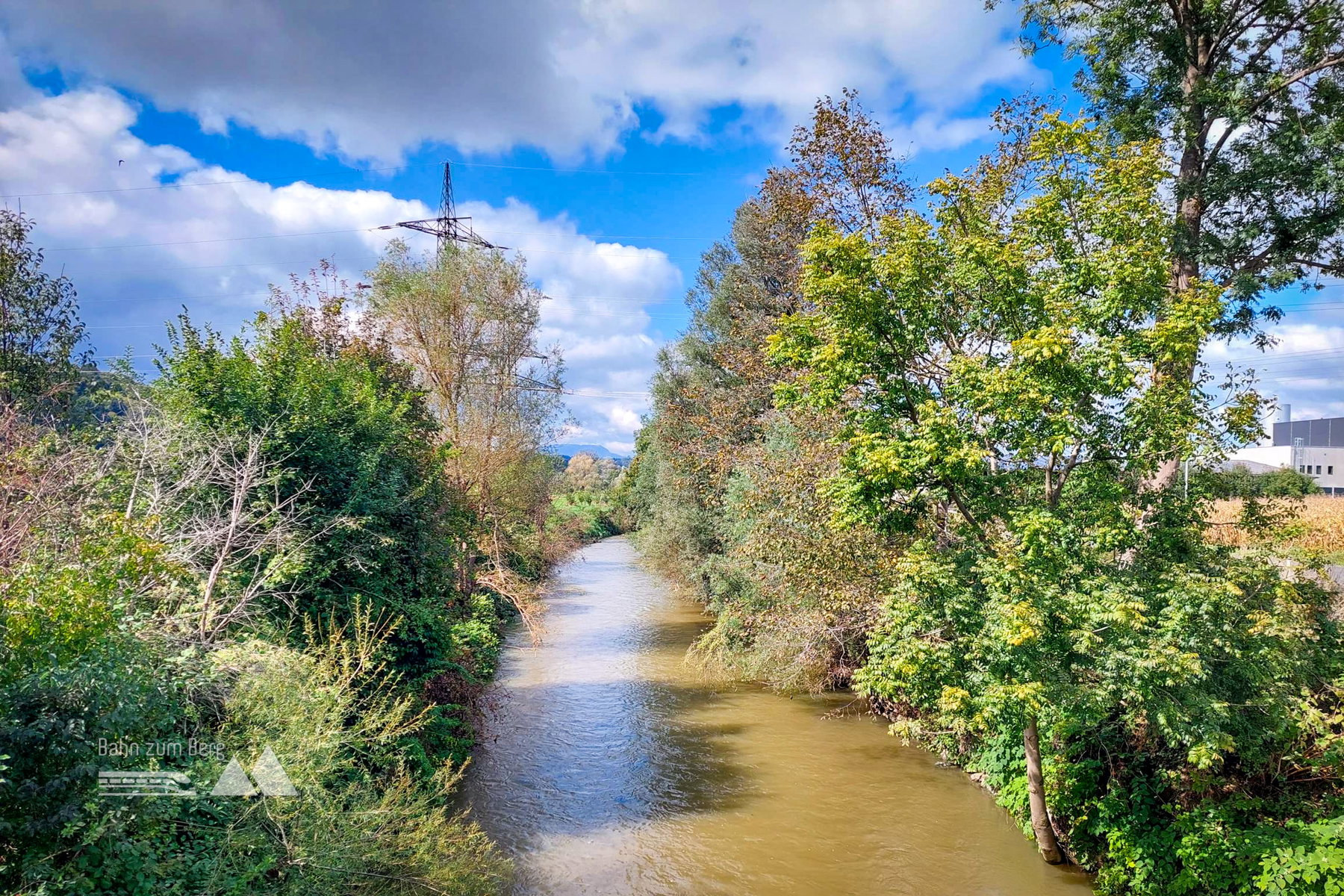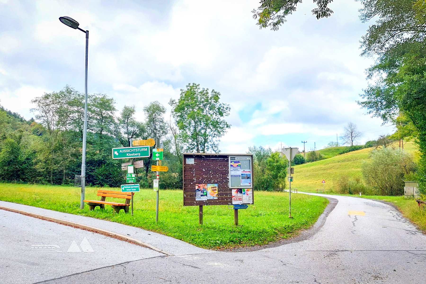 Vom Bahnhofsvorplatz, wo auch die Busse halten gehe ich über die Unterführung unter den Gleisen durch und komme beim Park & Ride heraus. In der Mühlgasse gehe ich unter der Autobahnbrücke durch und biege danach gleich links in den Urschaweg ein. Beim Ende des Weges folge ich der Straße nach links und gehe entlang der Raab bis zur nächsten Brücke, über welche ich den Fluss nach rechts überquere. Hier deutet auch ein Schild mein Ziel, den Kleeberg und den Aussichtsturm, an.
