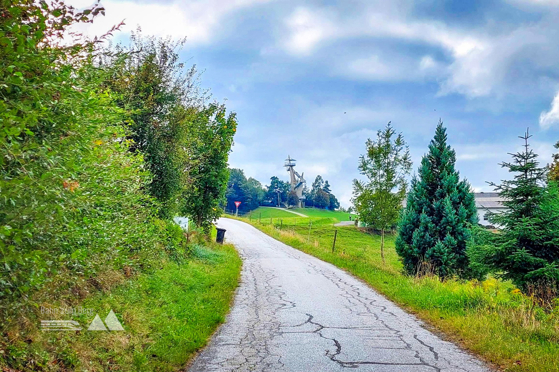 Ich gehe den Wiesenweg bergab und gehe an ein paar Häusern vorbei. An der Straße angelangt, folge ich dieser ein bisschen und biege dann in einer Linkskurve nach rechts in den Wald ein. Durch den Wald geht’s bergab – nach circa einem Kilometer komme ich zu einer anderen Straße.