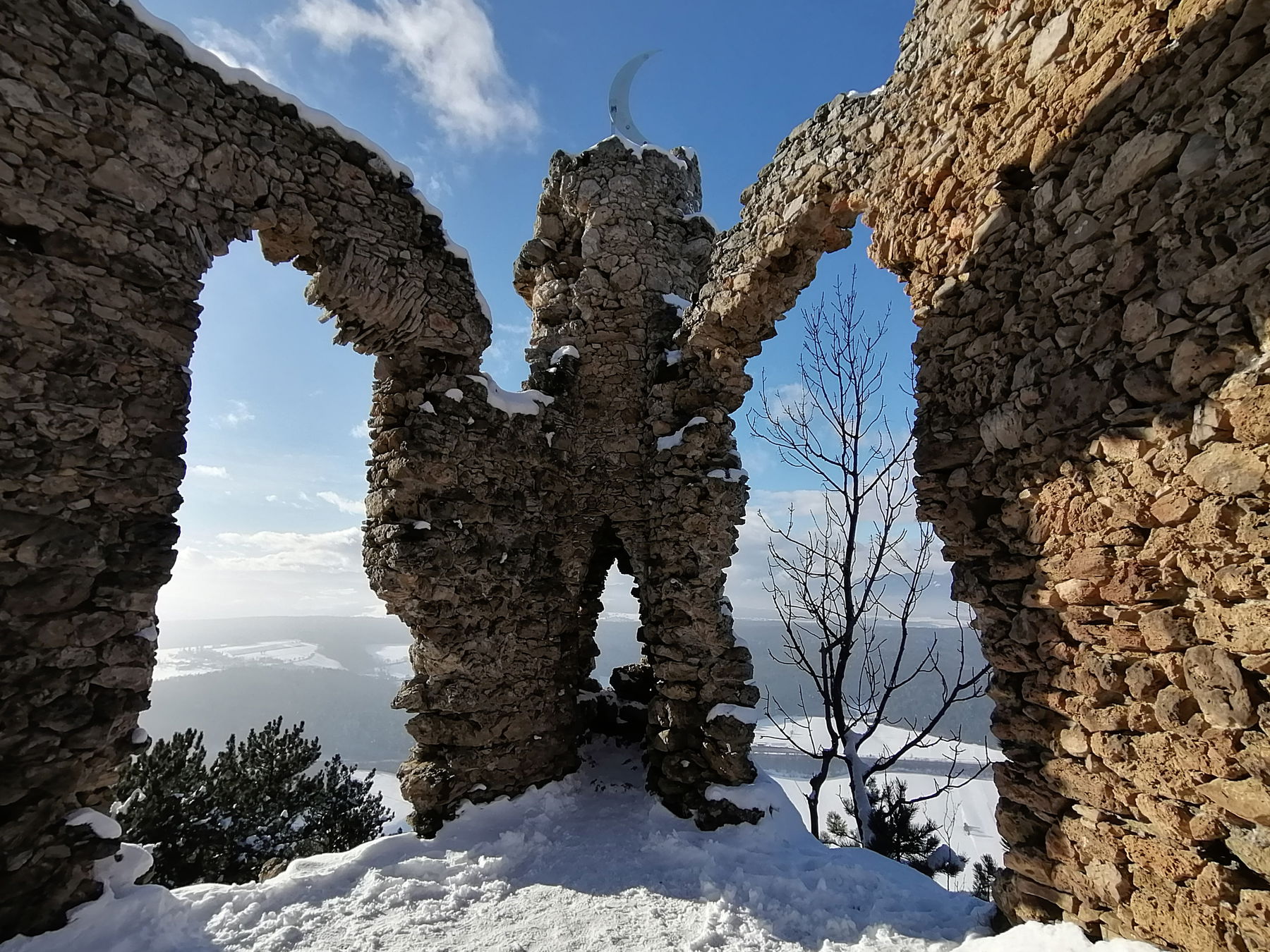 Wir sind ganz begeistert – dass wir so hoch über dem Ort stehen, hätten wir nicht gedacht. Da der Hinweg zwar stetig, aber recht gemächlich ansteigt, merkt man die Höhenmeter kaum. Der Ausblick auf den Ort und die Berge und „Buckel“ der Umgebung ist ganz fantastisch und das Abstürzen des osmanischen Heeres stellen wir uns angesichts der steilen Felsen ganz schön gruslig vor. Die Ruine am Türkensturz ist zwar künstlich, aber trotzdem ein tolles Fotomotiv. Und weil so ein schöner Samstag ist, legen wir uns gleich noch in die Wintersonne und machen eine Porridge-Pause.
