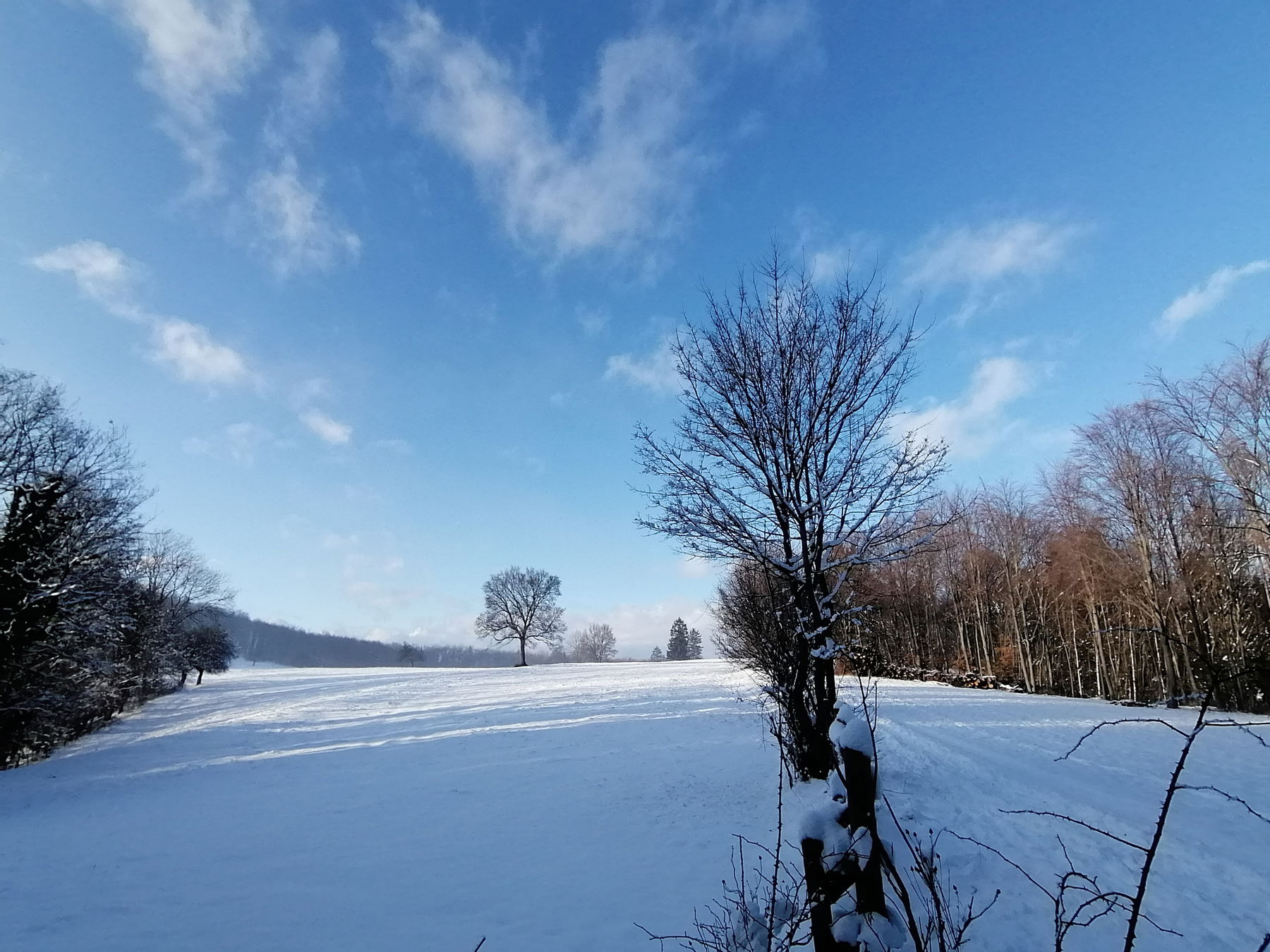 Auch im Sollgraben ist alles wunderschön verschneit und wir gönnen uns einige Fotopausen. Wenn man in die kleine Siedlung im Sollgraben kommt, geht der Weg im 90Grad-Winkel nach links leicht bergauf, an schönen Winterwiesen vorbei und wieder in den Wald hinein. Eine Familie mit Kindern begegnet uns, alle mit ganz roten Wangen und jederzeit bereit für die nächste Schneeballschlacht.