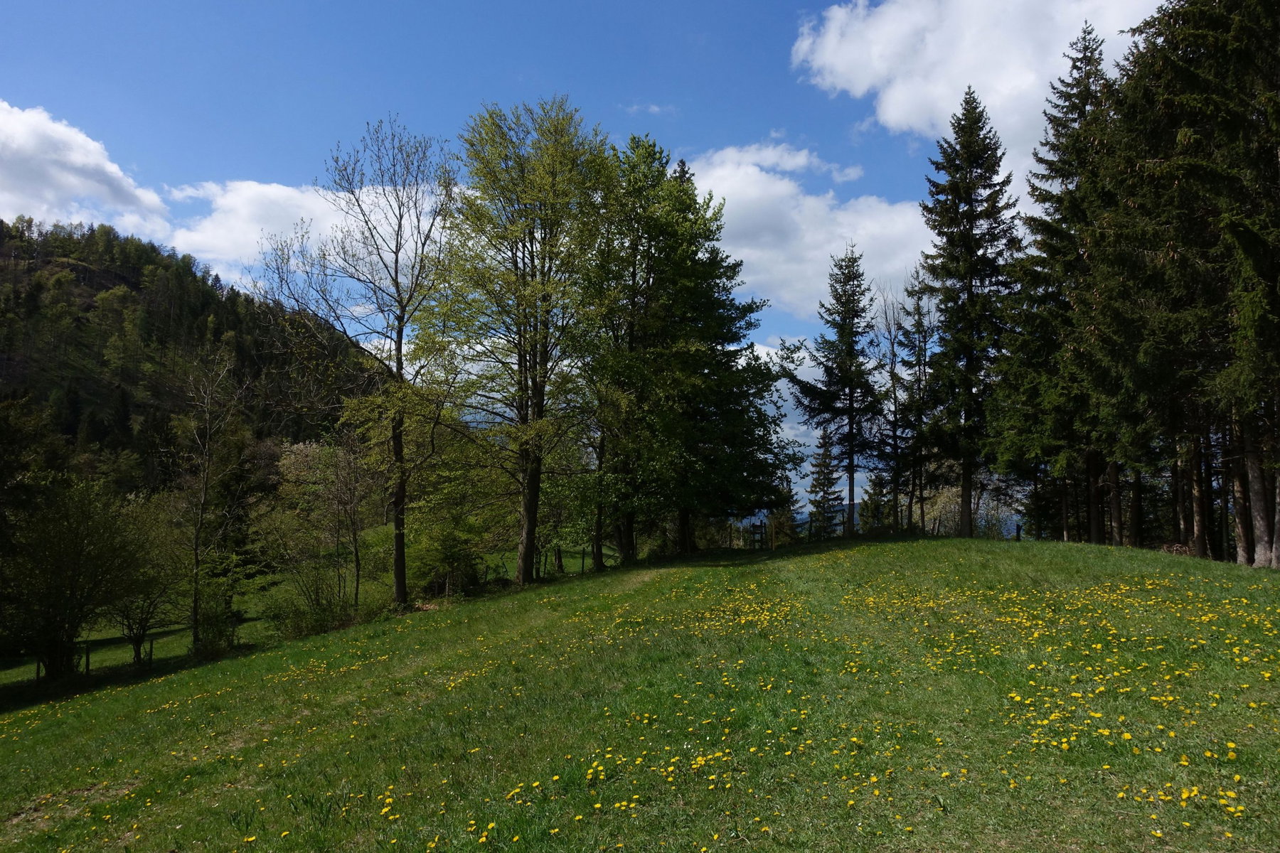 Nach einer kurzen Straßenetappe (vorbei an der Lurgrotte) biege ich Richtung Badlgraben ab und bin bald mitten im schönsten Wald. Später führt mich der Weg über Wiesen und Felder, durch das Dorf Schönegg und hinauf zum Trötschsattel, zuletzt wieder durch Wald.