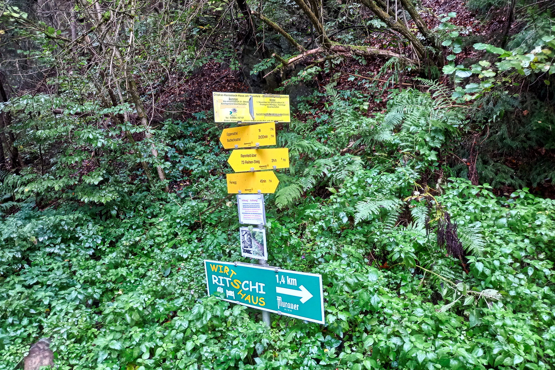 Noch vor der Kirche biege ich scharf links ab und wandere zunächst 2 Kilometer auf der Asphaltstraße in den Gabraungraben hinein, bis ich einen kleinen Wanderparkplatz erreiche. Über eine Brücke verlasse ich nun die Straße und folge dem Wegweiser „72-Reihen-Steig auf das Rennfeld“.