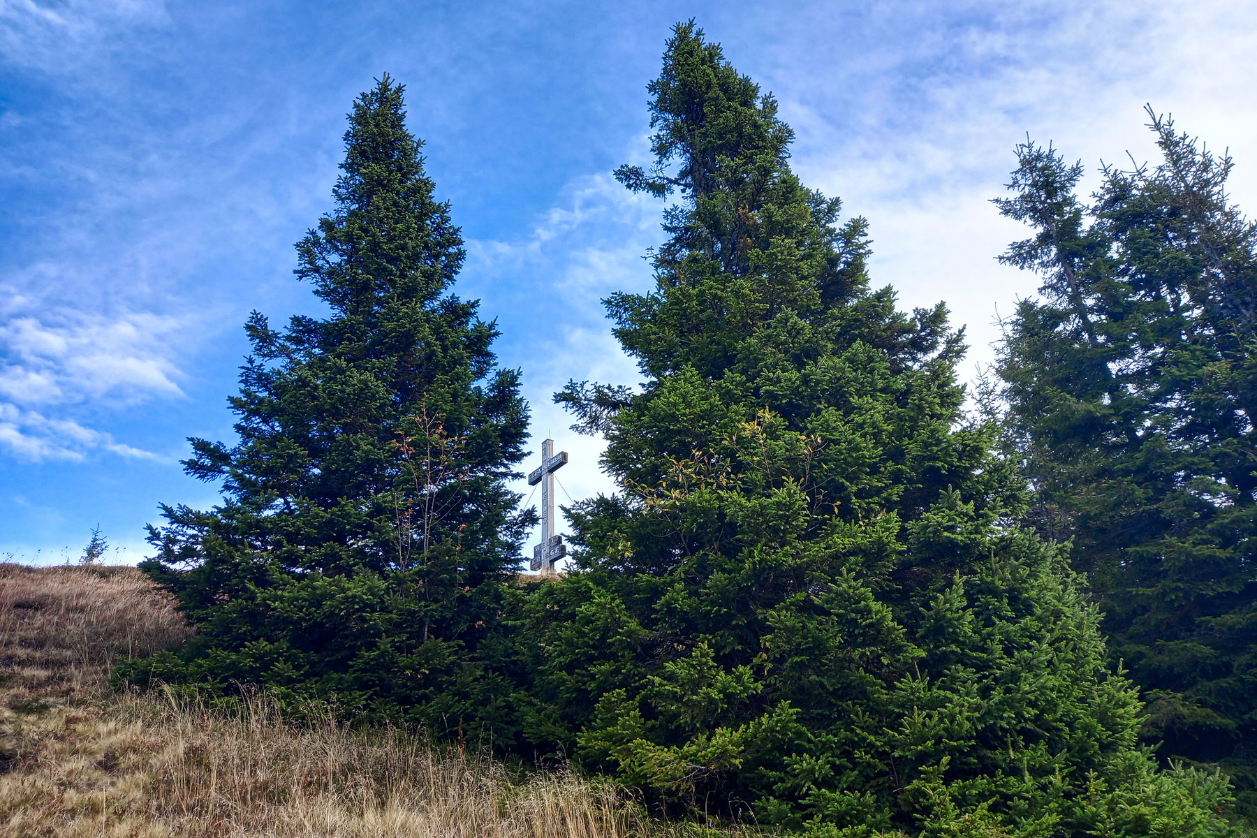 Noch 30 Minuten, bis ich das Gipfelkreuz erblicke und die letzten Meter zum Gipfel hinter mir habe. Während mir der Wind beim Aufstieg durch den Wald nicht viel anhaben kann, bin ich auf dem Gipfel froh über meine Windjacke. Der Wind bläst mir ganz schön um die Ohren. Und ich muss wieder an Petrarca und seine Besteigung des Mont Ventoux (des „windigen Berges“) denken. Und so bin auch ich aus reiner Neugier und dem Wunsch, eine für mich neue Variante kennenzulernen, auf das Rennfeld gewandert.