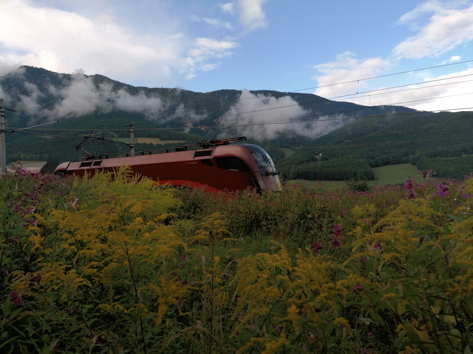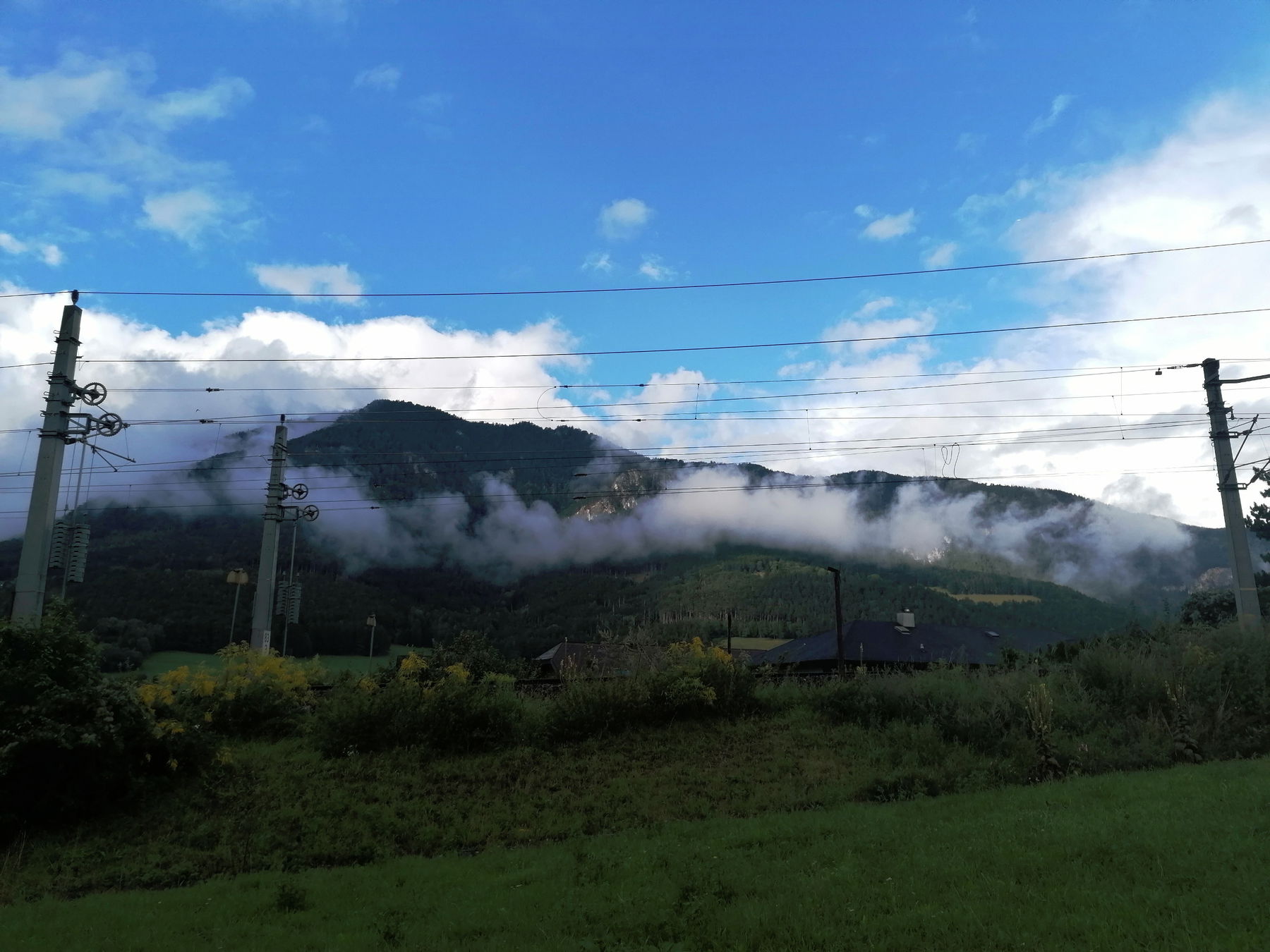 Und da kommt auch wieder die Sonne heraus und wir werden für unser Durchhaltevermögen belohnt! Mit einer tollen Wolkenstimmung begleiten wir die Semmeringbahn noch ein kleines Stück lang, bis zur Haltestelle „Küb“. Achtung: Die Züge Richtung Payerbach-Reichenau bzw. Wien fahren auf der anderen Seite des Bahnsteiges, also am besten gleich bei der ersten Möglichkeit die Fußgängerunterführung nutzen und auf die andere Seite gehen.