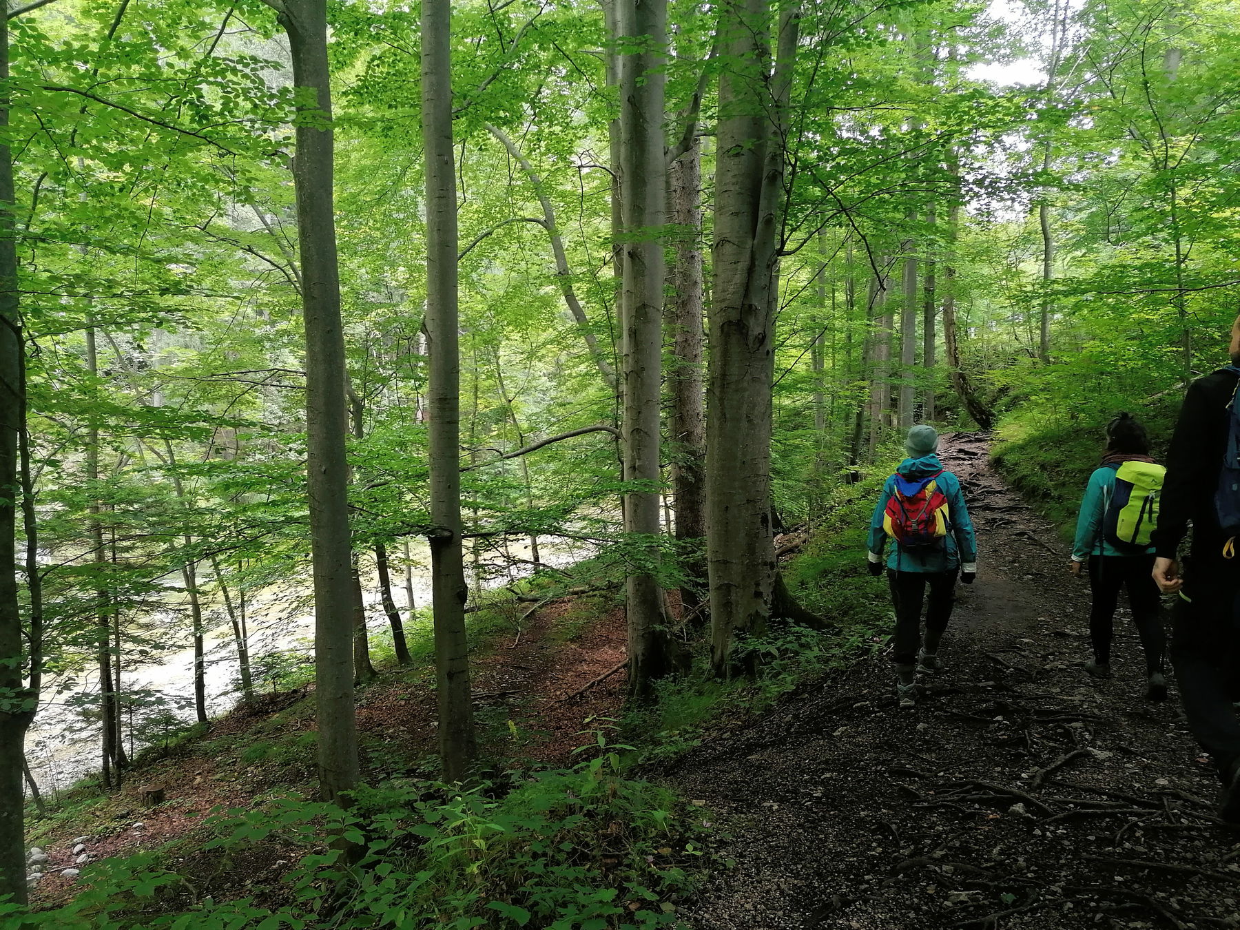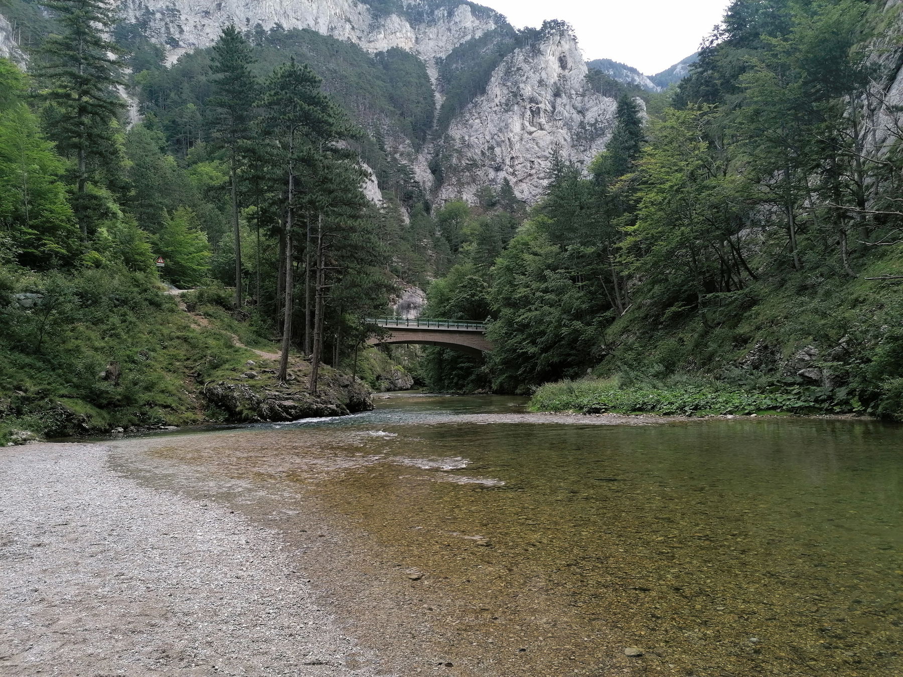 An heißen Tagen gibt’s hier endlos viele, unglaublich schöne und leicht zugängliche Badeplätze an der Schwarza. Mit dem Blick auf die Regenwolken über der Rax, die langsam näher kommen, lassen wir unsere Handtücher im Rucksack stecken und packen zum wiederholten Male die Regenjacken aus. Aber die wirklich schöne Landschaft entschädigt und dennoch für das nicht ganz passable Wetter.