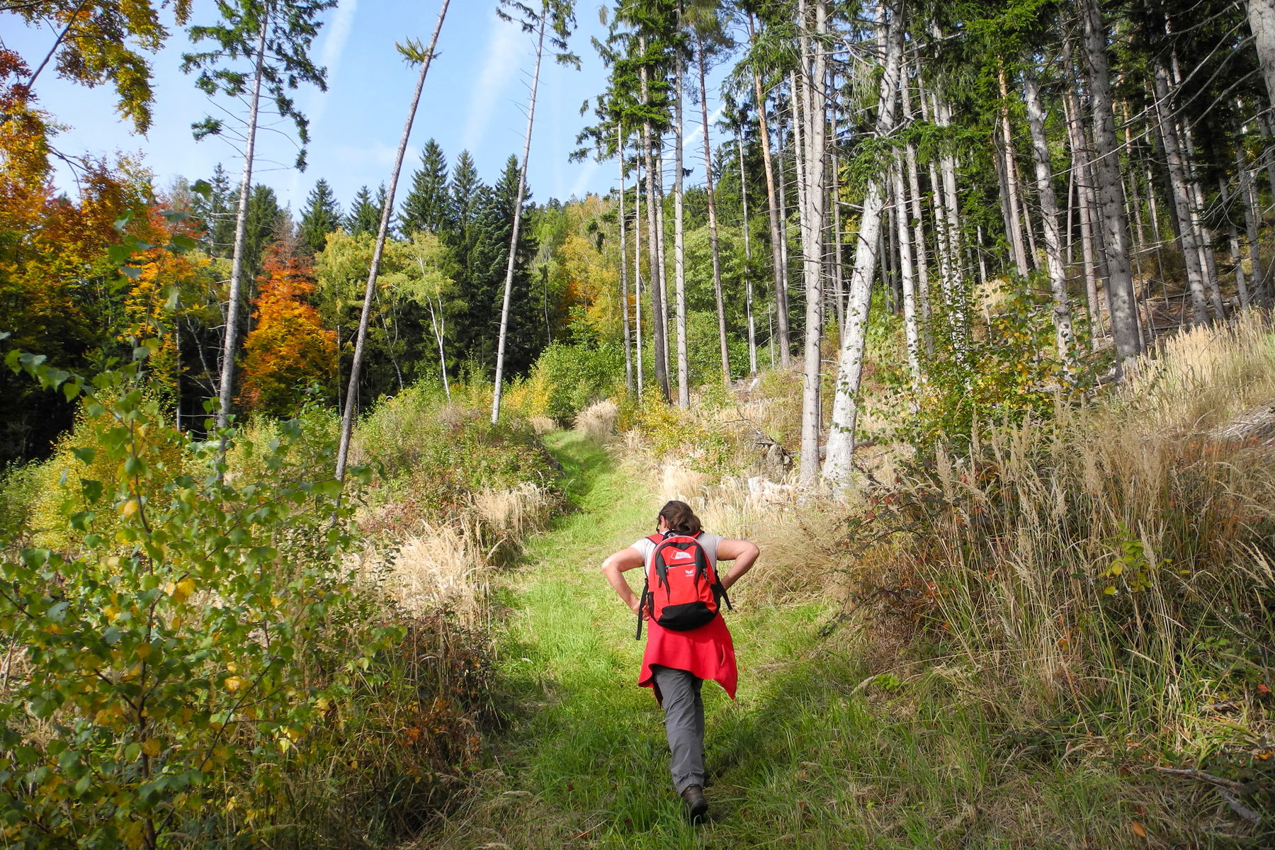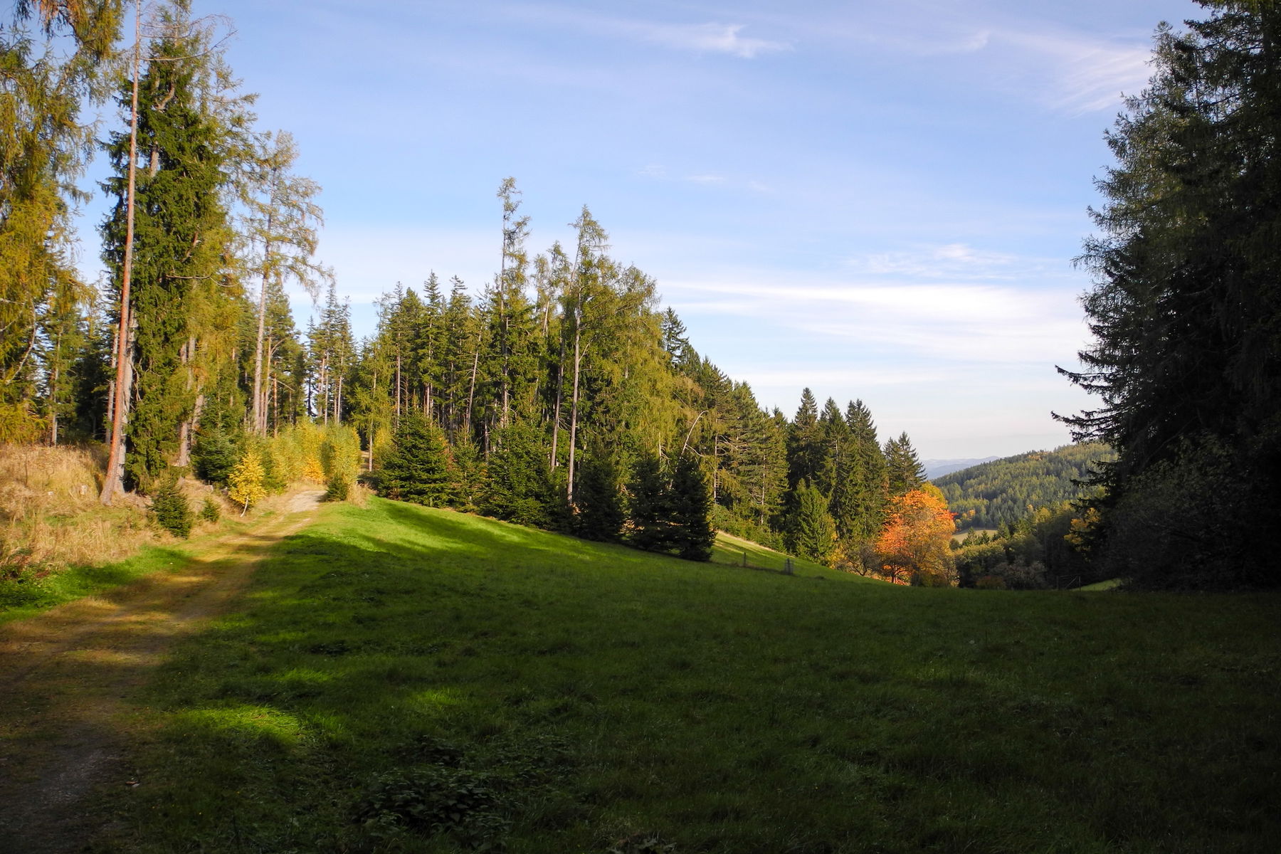 Das funktioniert auch wunderbar und schon bald haben wir nach einem etwas steileren Anstieg den schön angelegten Weg auf die Sommerhöhe erreicht. Dort biegen wir links ab auf den Forstweg Richtung Kreuzberg. Und nun passiert das Unerwartete: Meine Begleiterin – eine passionierte Schwammerlsucherin – entdeckt ein verspätetes Eierschwammerl neben dem Weg und sofort erwacht das Jagdfieber. Nur mit einiger Mühe kann ich sie eine halbe Stunde später wieder zurück auf Weg zur Speckbacherhütte lotsen.