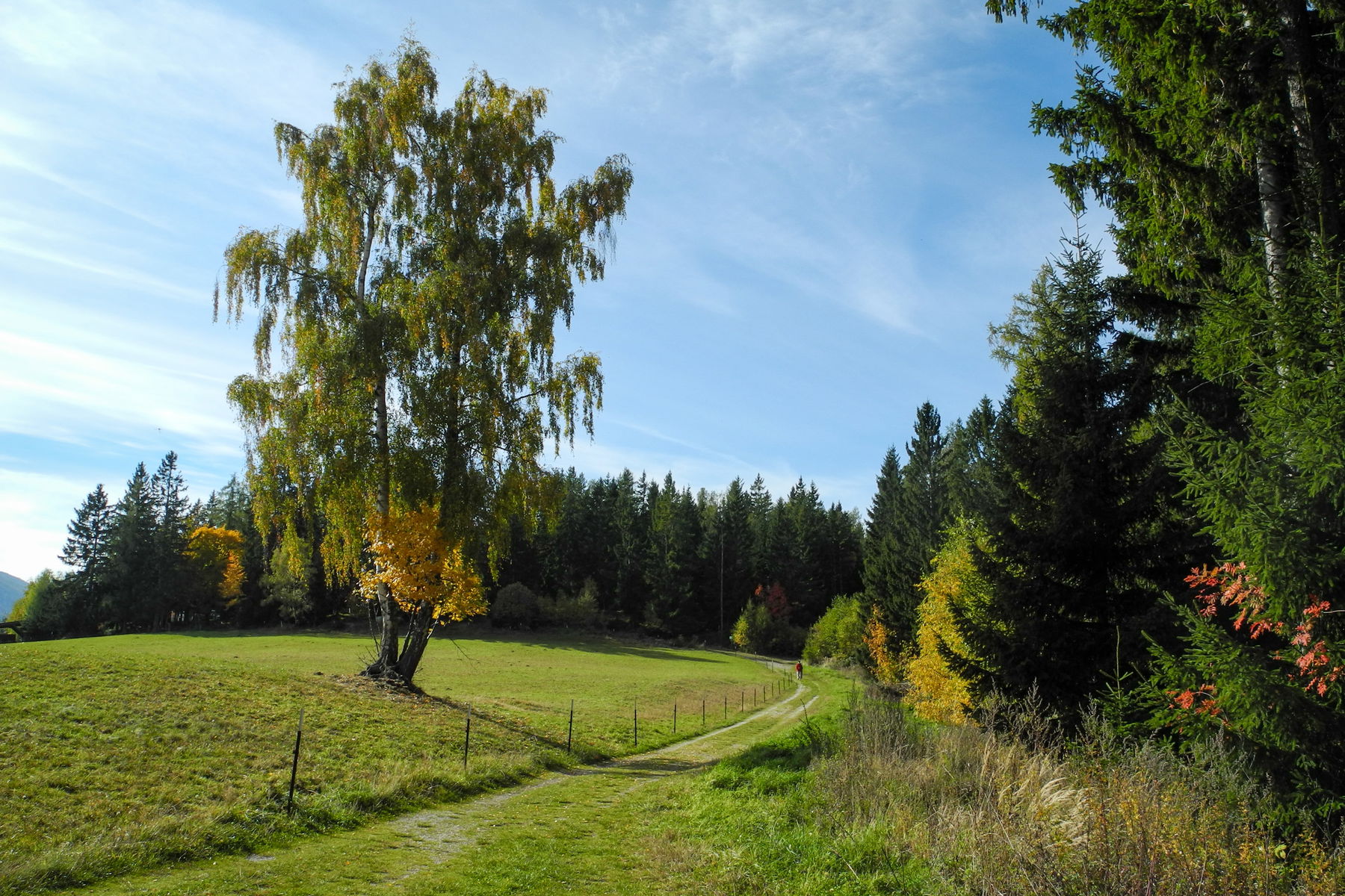 Weiter geht’s am Waldrand entlang in Richtung Speckbacherhütte, die eigentlich eher ein Ausflugsgasthof ist, zu dem man sogar mit dem Auto zufahren kann. Das erkennt man auch daran, dass hier viele Spaziergänger unterwegs sind. Und im Gastgarten erwartet uns die nächste nette Überraschung: ein befreundetes Ehepaar aus Wien. Sie laden uns an ihren Tisch ein, was ein großer Vorteil ist, denn dank des herrlichen Wetters der Gastgarten voll.