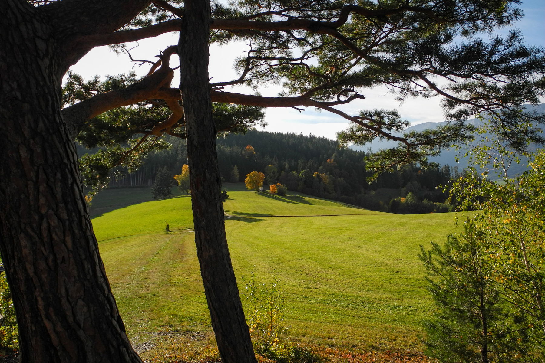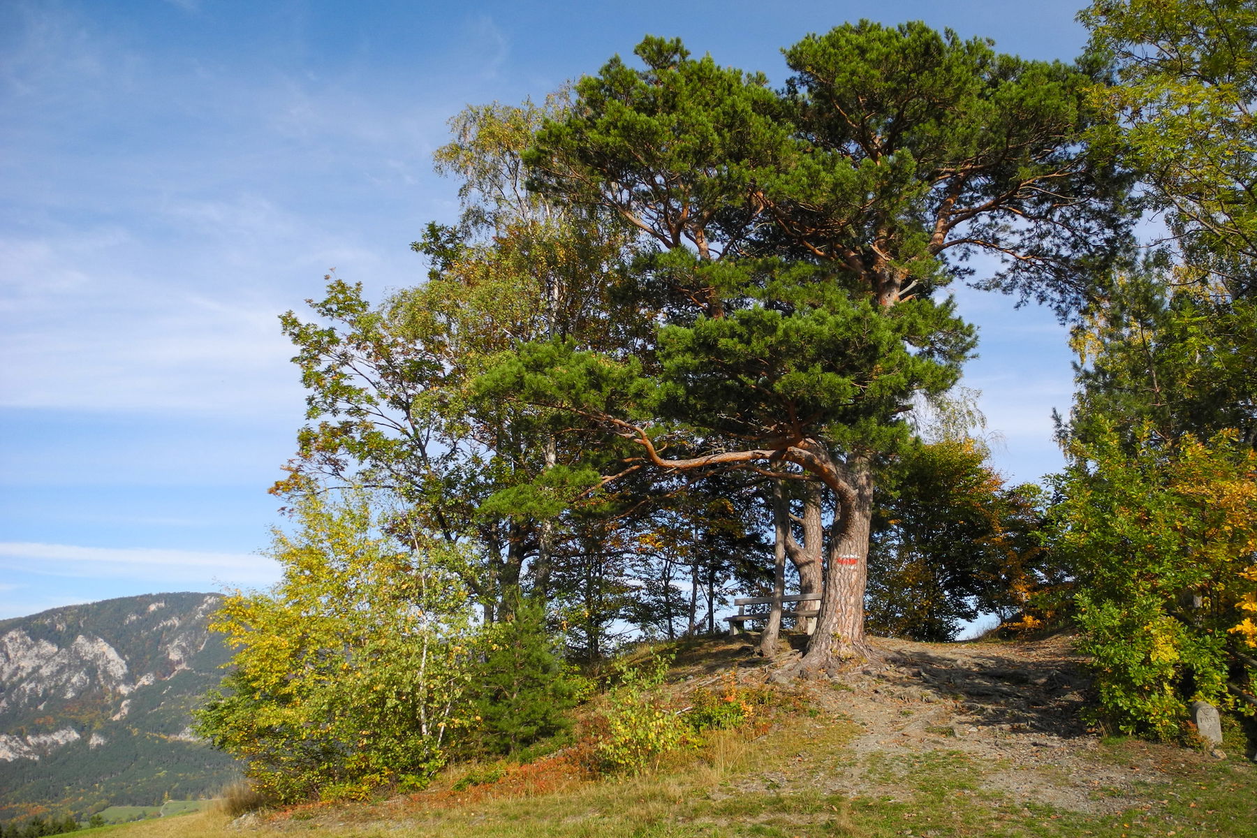 Es gibt auf der Stojerhöhe mehrere Rastplätze, aber mein Lieblingsbankerl steht unter der beeindruckenden Föhre am nordöstlichen Ende der Höhe.