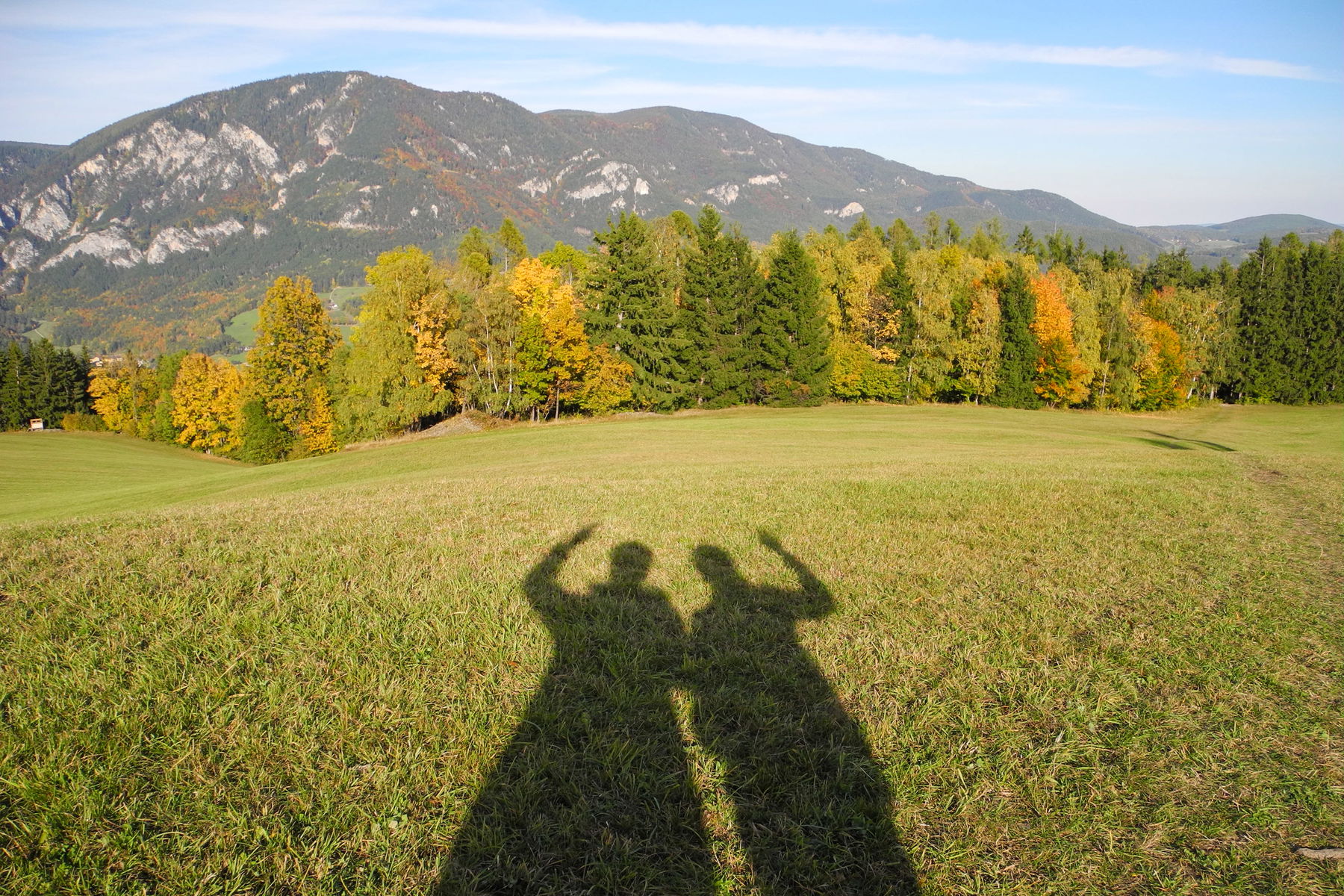 Noch einmal queren wir ein kurzes Wiesenstück und die schon tiefstehende Sonne ermöglicht uns noch ein lustiges Abschiedsfoto. Danach geht’s über einen schönen kleinen Waldweg stetig bergab in den Payerbachgraben. Dort treffen wir auf eine kleine, kaum befahrene Straße, die uns immer geradeaus nach Payerbach führt.