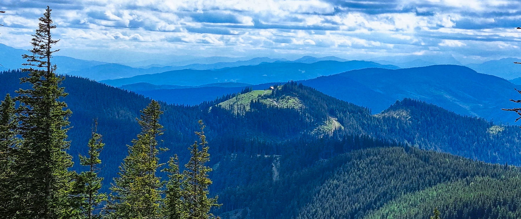 Ich folge dem Weg in Richtung Drahtekogel (auch Trattekogel) und spaziere über eine aussichtsreiche Almwiese entlang der Landesgrenze NÖ – Steiermark bis zum bewaldeten Gipfel des Drahtekogels. Dort gehe ich ein paar Minuten abwärts bis zu einem Forstweg. Hier bestünde die Möglichkeit, rechtshaltend direkt zum Preiner Gscheid abzusteigen. In der Ferne erblicke ich die steirische Seite der Rax und, ganz im Westen, die Hohe Scheibe mit der kleinen Scheibenhütte.