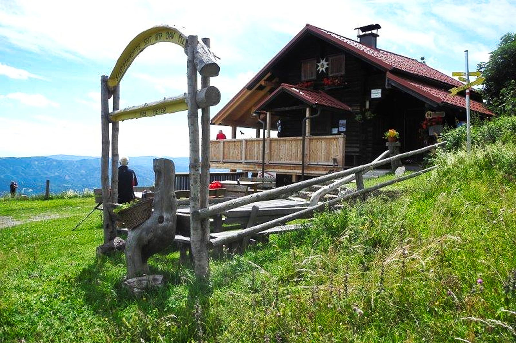Nachdem ich aber bis in den Naturpark Mürzer Oberland und vor allem zur Großen Scheibe möchte, wandere ich weiter bis zur Gipfelwiese derselben. Dort steht auch die kleine gemütliche Hütte, eine der ersten Skihütten des gesamten Alpenraumes, heute an den Wochenenden ganzjährig einfach bewirtschaftet.