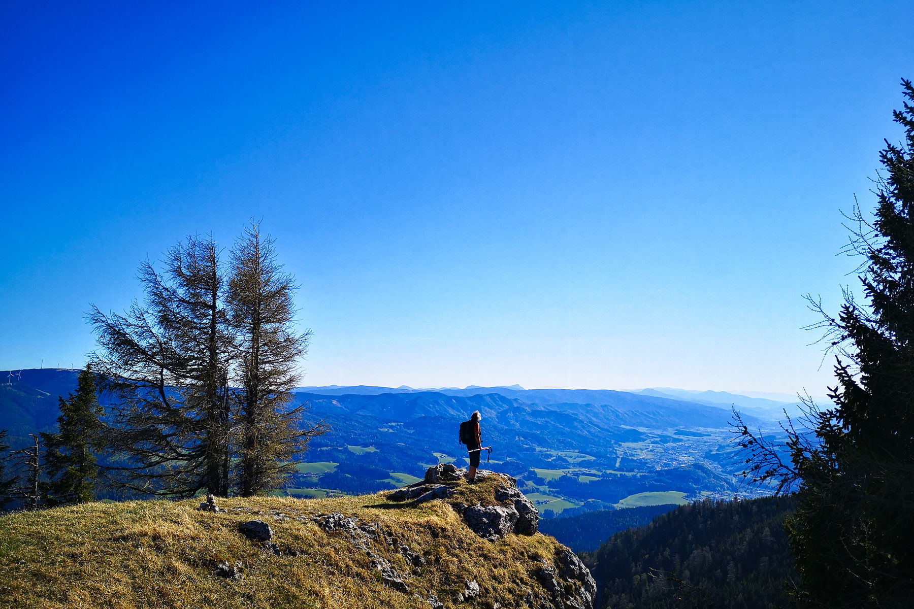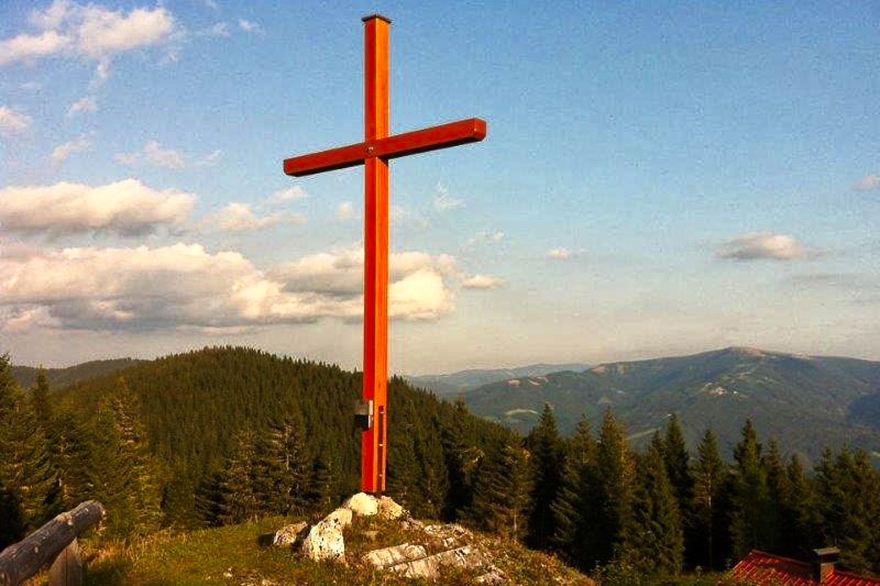 Ich genieße die herrliche Aussicht auf dem 1.473m hohen Gipfel und eine Rast auf der Scheibenhütte, ehe ich über den benachbarten Dürrkogel bergab meinem Ziel, den kleinen Ort Kapellen, entgegenwandere. Zuletzt führt der Steig vorbei an der Bleiweißgrube (frei zugängliche Höhle, altsteinzeitliche Besiedlungsfunde) und vorbei am Plodererkreuz (schöner Blick auf die Rax und Altenberg an der Rax) nach Kapellen.