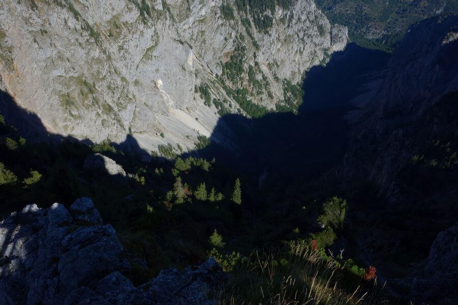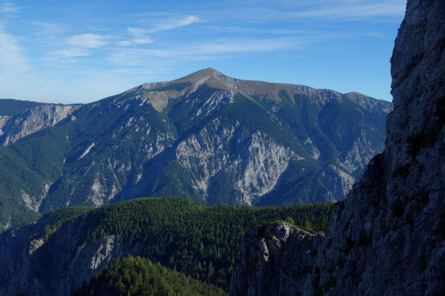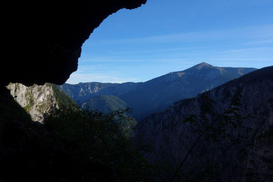 Über den oberen AV-Steig erreiche ich die Höllentalaussicht am Rand des Raxplateaus. Ein idealer Platz für eine Pause! Ich genieße die Aussicht zu den Nachbarbergen, vor allem natürlich zum dominanten Schneeberg, und ebenso die Blicke ins tief unter mir liegende Große Höllental, durch das ich erst vor wenigen Stunden bergwärts gewandert bin.