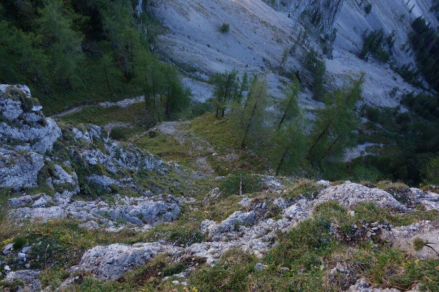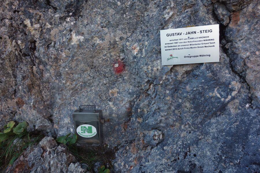 Nach dieser Halbhöhle ist eine versicherte, aber technisch unschwierige, jedoch etwas ausgesetzte (und wegen eines Rinnsals immer feuchte) Passage zu bewältigen. Dann folgt wieder Gehgelände, und es dauert nicht lange, bis ich nach links abbiege, in Richtung Gustav-Jahn-Steig. Beim Einstieg des Steiges mache ich Pause, es ist Zeit für ein zweites Frühstück, das erste habe ich im Bus zu mir genommen.
