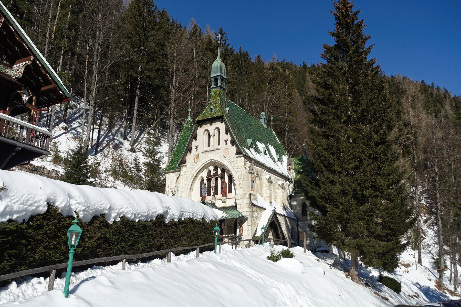 Vom Bahnhof folgen wir zuerst den Schildern zur Passhöhe, Hotel Panhans und zur Pfarrkirche Heilige Familie, die der Weg mit wenig Abstand fast umrundet.